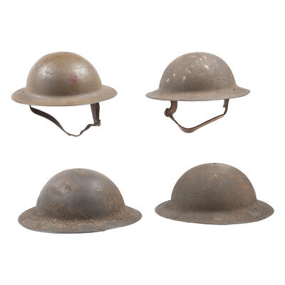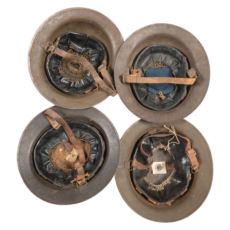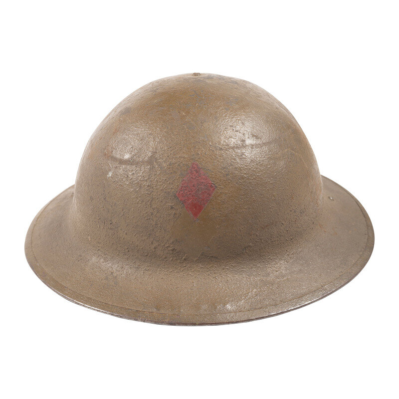 Lot of Four US Model 1917 steel helmets with textured brown painted finish, and mounting leather suspension and textile pad retained by rivets. One helmet is painted with a single red diamond, the iconic logo of the US Army's 5th Infantry Division. The diamond is painted just above a diamond shaped indentation in the finish, suggesting the helmet was repainted and the marking reapplied.