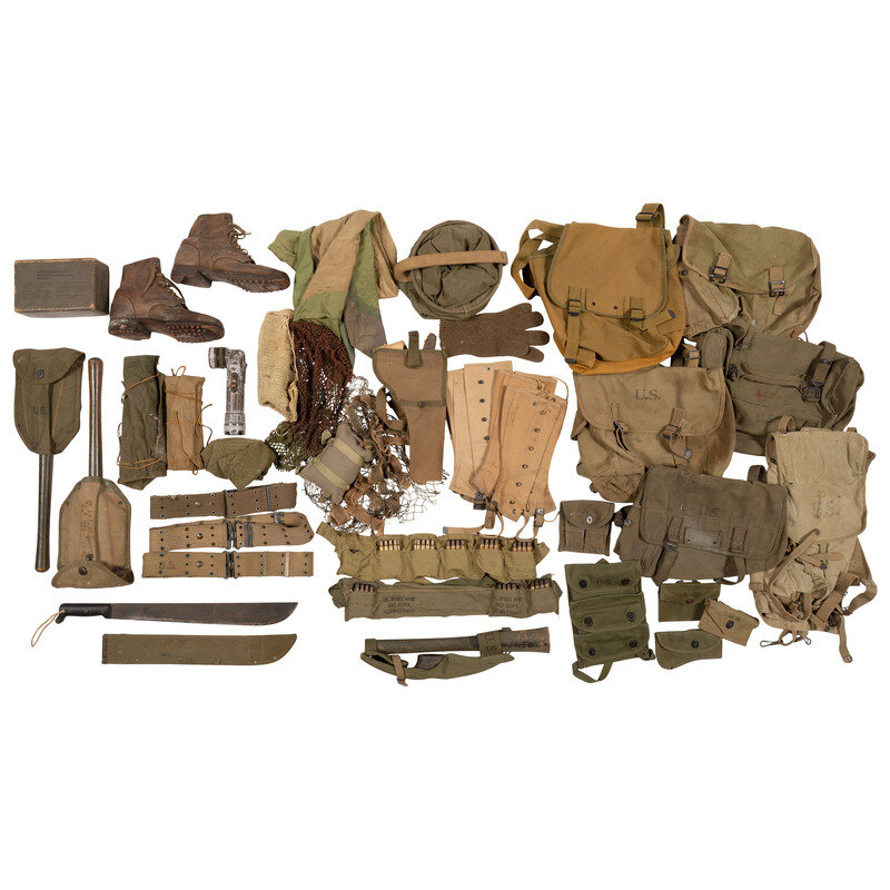 Mixed lot of US militaria from the World Wars era includes one pair of AEF marching shoes, six haversacks, two M1 Garand clip bandoliers with inert ammunition, two entrenching tools, and more.