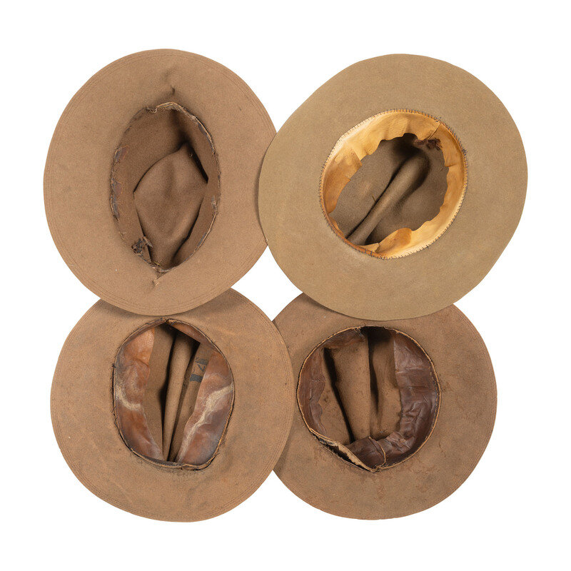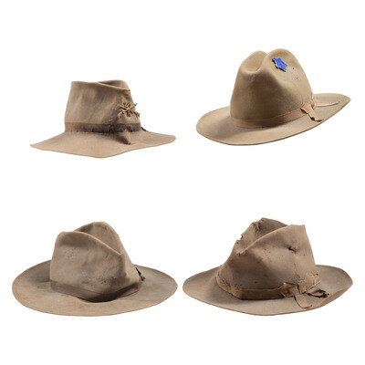 Lot of four felt wool slouch hats, all with ribbon bands and hand punched star ventilation in each flank. All hats have hand stitched sweat bands and non rolled edges. No visible maker marks to sweat bands. One hat mounts the {23/Crossed Muskets/A} mark for Company A of the 23rd Infantry Division, with one hat mounting a blue 5th Corps pin. Remaining hats are without pins or insignia.