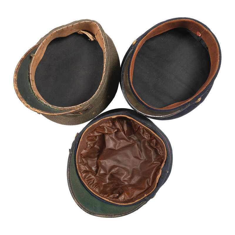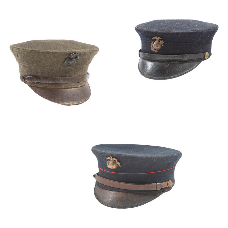 2.) United States Marine Corps 1912 Pattern Bell Crown Undress Hat with {Eagle, Globe, and Anchor} pin, and black leather visor. Item features a black satin liner, and mounts a size 7 1/2 tag to the sweat band.