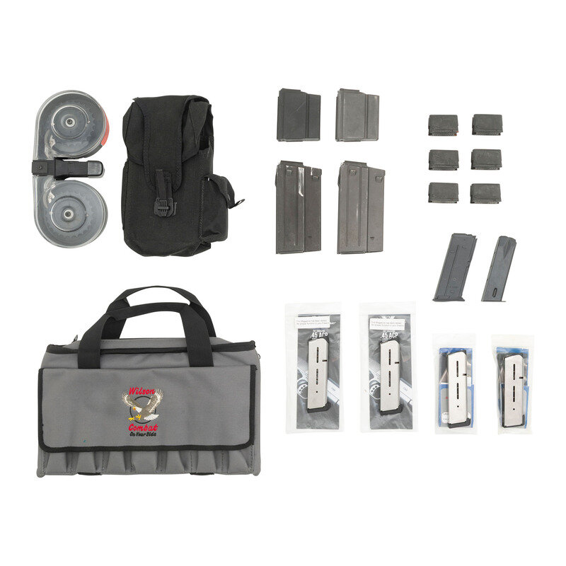 Lot includes one 9mm Caliber Beta C mag, two scarce Beretta BM-59 magazines, two ARMALITE marked AR-10 magazines, one FN Five-seveN pistol magazine, six M1 Garand en-bloc clips, and four Wilson Combat 8-shot 1911 pattern magazines. Comes with a Wilson Combat soft case.