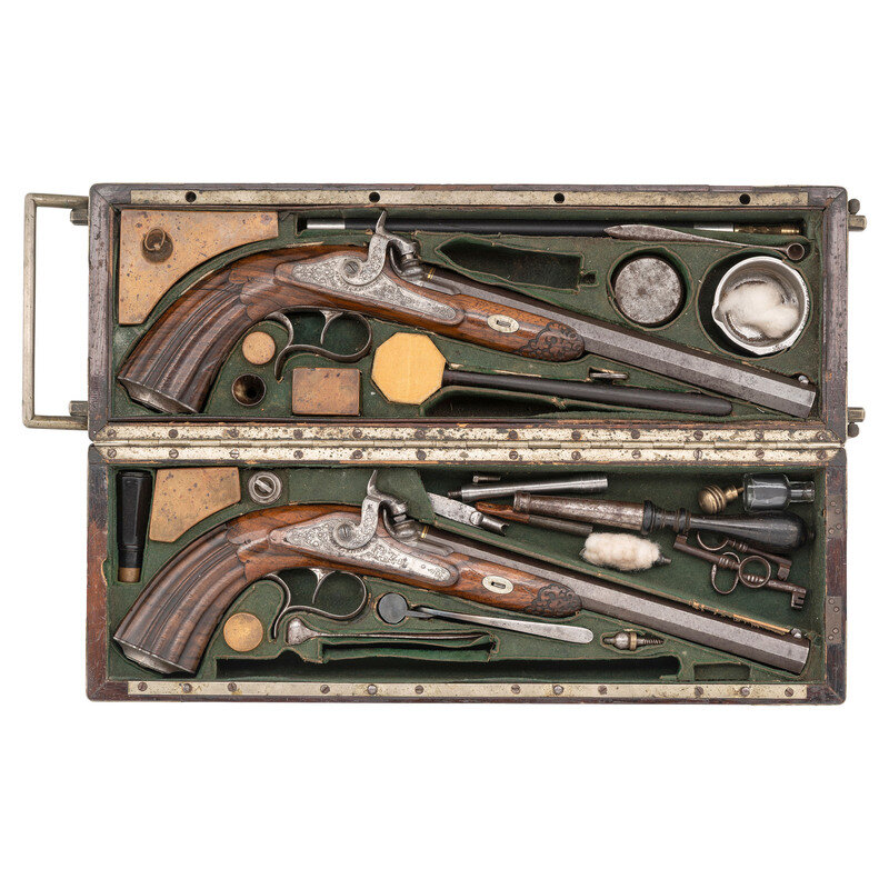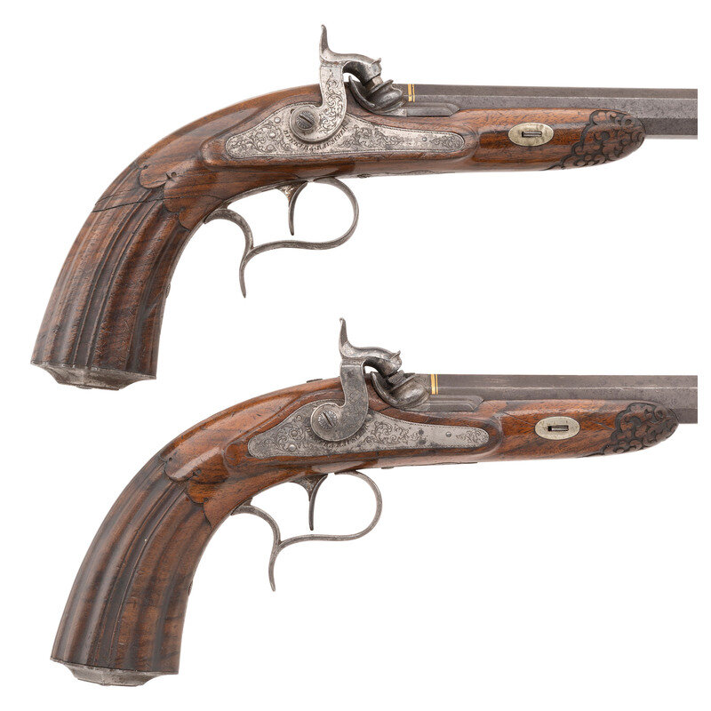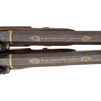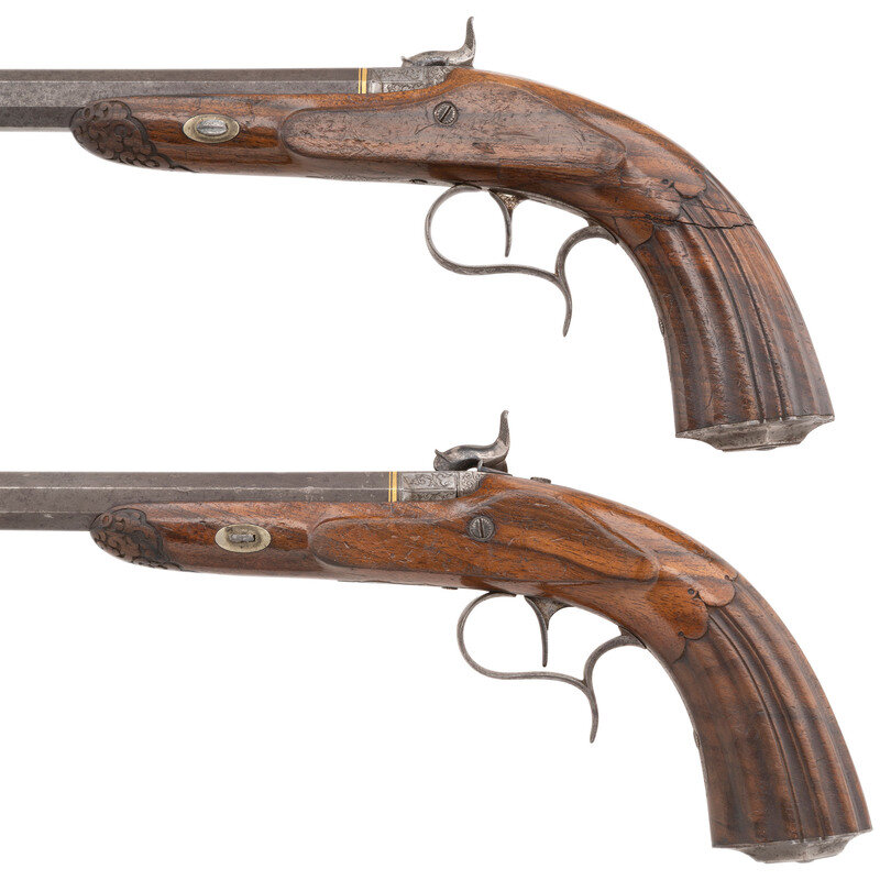 13mm (.51 caliber). 10.5" hooked breech, wedge retained swamped octagonal barrels. SN: 3619. Blued finish, gilt decorations, French gray locks, European hardwood stocks with carved forend tips and fluted grips. Single shot percussion muzzleloading target pistols with fixed notch rear sights and dovetailed blade front sights. Foliate scroll engraved percussion locks are marked BEKKER & RAUSCHER in an arc under the hammers. Barrels are marked in French in gold BEKKER & RAUSCHER A VARSOVIE (Warsaw) with foliate engraved breeches marked 1 and 2, gold bands at the breeches and gilt floral decorations on either end of the barrel markings. Pistols are made in the style of French and Belgian target pistols of the era with fluted grips, finger spur triggerguards and microgroove rifling. The firm of Becker (Bekker) and Rauscher worked in Warsaw, Poland, circa 1840-1860 with Karl Bekker having worked on his own starting about 1830, partnering with Rauscher in 1840. The pistols are contained in their original compartmentalized two section travel case with removable divider between the guns. The case is lined in green baize with some lidded copper compartments fitted accessory storage areas. Some of the accompanying accessories include the single cavity blued iron round ball scissor mold, the bullet starting mallet, an ebony handle to accept the screwdriver/cone wrench combination tool and a handle for a multitool that accepts the brass bullet starter head, a brass jag, a fiber wiper and a ball puller. A metal tipped ebony loading rod that may be a later replacement and is present and threaded to accept tools as well. Some accessories like one of the loading rods are missing. Also included are three keys, none of which fit the lock for the case and a small glass bottle. {ANTIQUE}