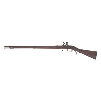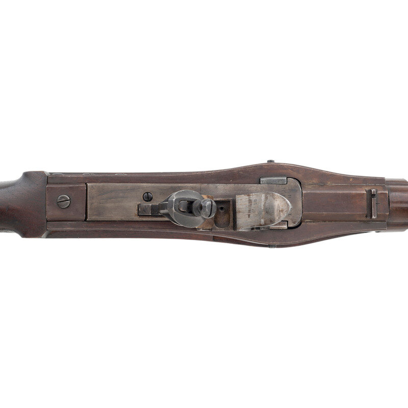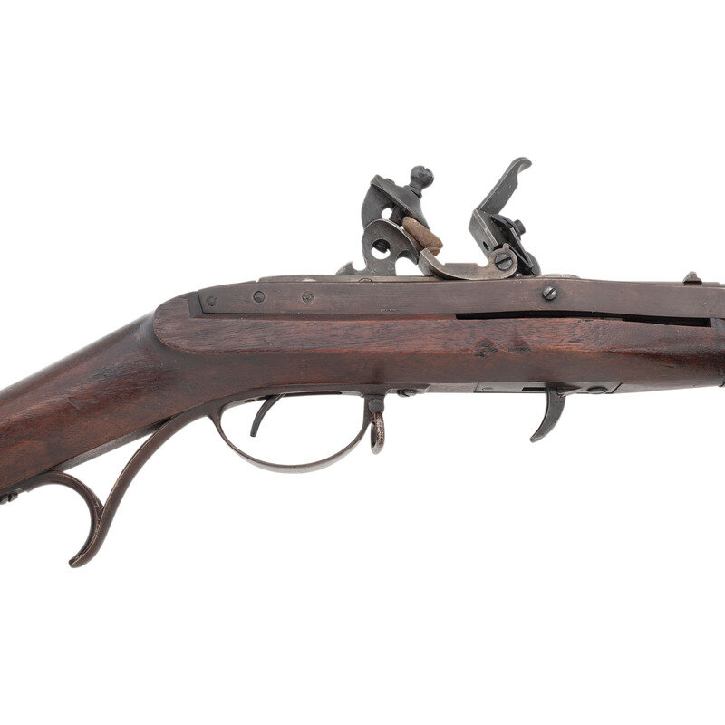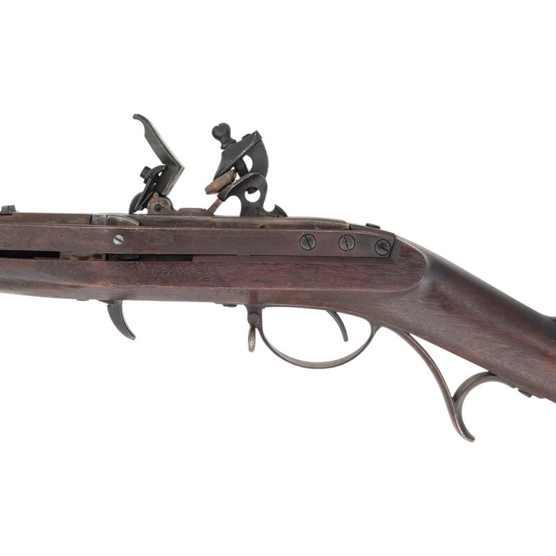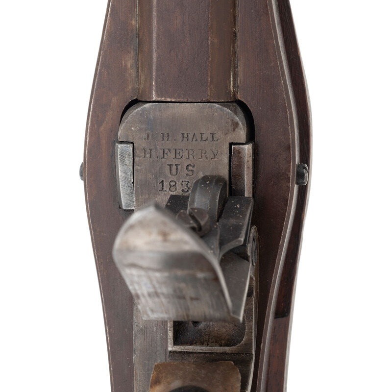 .52 caliber. 32.625" round barrel secured by three pin-retained flat bands. NSN. Browned finish, color casehardened breech, iron furniture, smooth walnut stock. Single-shot, breechloading flintlock rifle with Hall's patent tilting breech block, fixed notch offset rear sight, offset blade front sight with base serving as the stud for a socket bayonet, sling swivels and a button head cleaning and clearing rod. Top of breech block marked in four lines: J.H. HALL/H. FERRY/US/1837. Action remains unaltered and in original flint. The Hall holds the distinction of being the first firearm to be produced on the principle of interchangeable parts at a US Arsenal. 19,680 Hall Rifles were produced at the Rifle Works at Harpers Ferry in three major production runs, 1819, 1823-24 and 1827-1840. This is fine example of a second production type produced in the third run of manufacturing, prior to the death of John H Hall. {ANTIQUE}