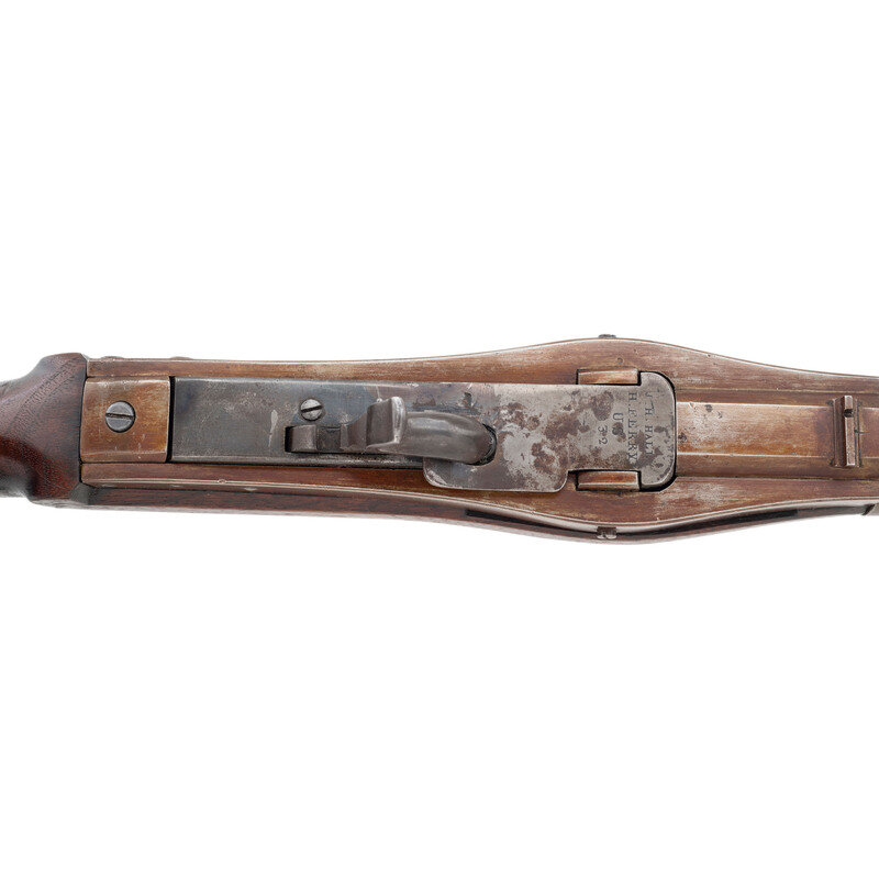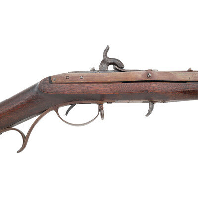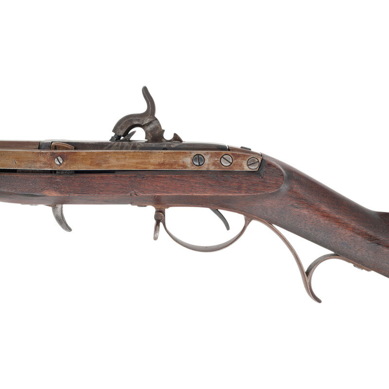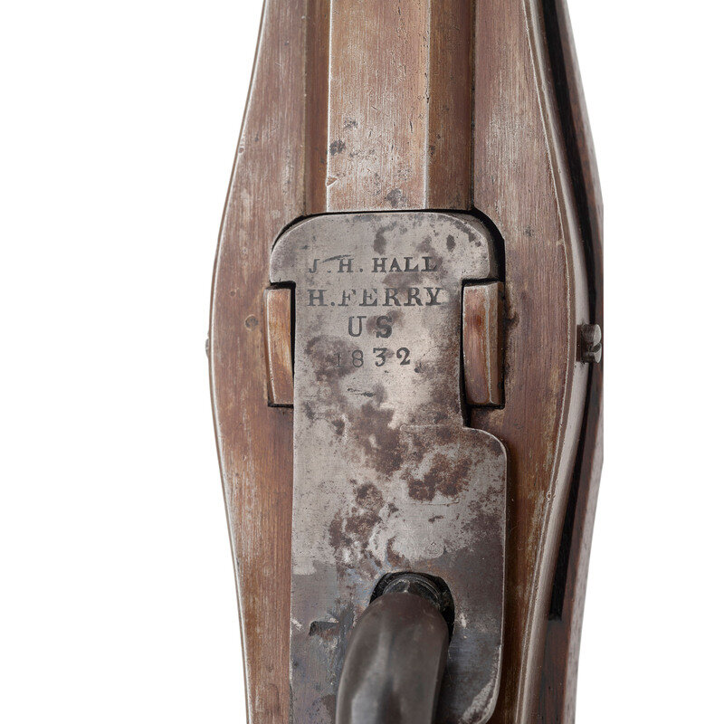 .52 caliber. 32.625" round barrel secured by three pin-retained flat bands. NSN. Browned and color casehardened finish, iron furniture, smooth walnut stock. Single-shot, breechloading percussion altered rifle with Hall's patent tilting breech block, offset notch rear sight, offset combination front sight and socket bayonet lug, sling swivels and a button head cleaning and clearing rod. Top of breech block marked in four lines: J.H. HALL/H. FERRY/US/1832. Action altered to percussion by an unknown Federal contractor circa 1861. This is clearly the standard Northern alteration to percussion and not one of the more exotic Confederate alterations. A nice example of the first US military arm to be produced at a national armory on the principle of interchangeable parts, altered to percussion from flint to extend the service life of the rifle and likely held in reserve for issue at the outbreak of the Civil War. {ANTIQUE}