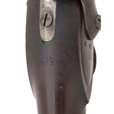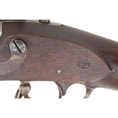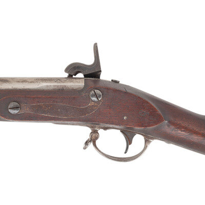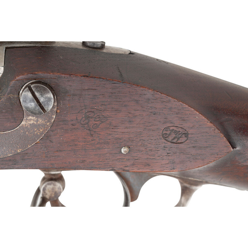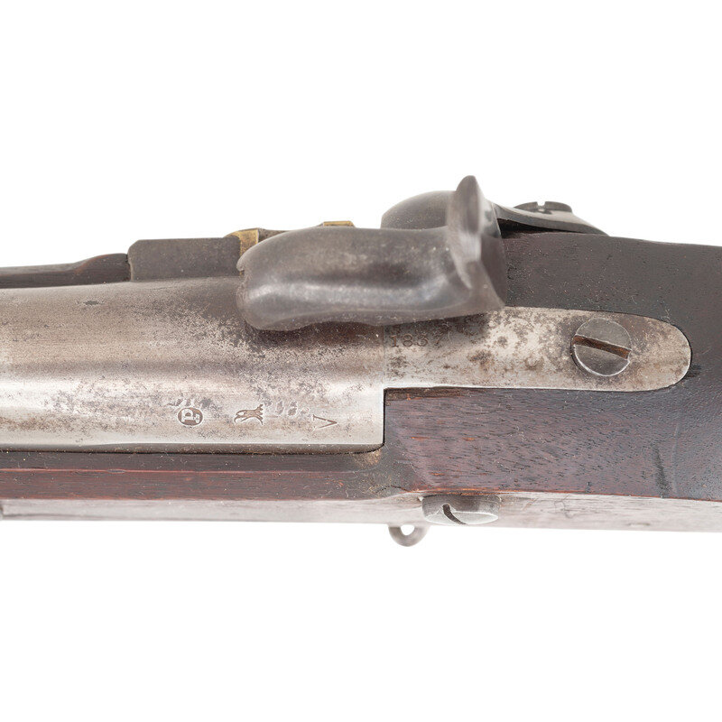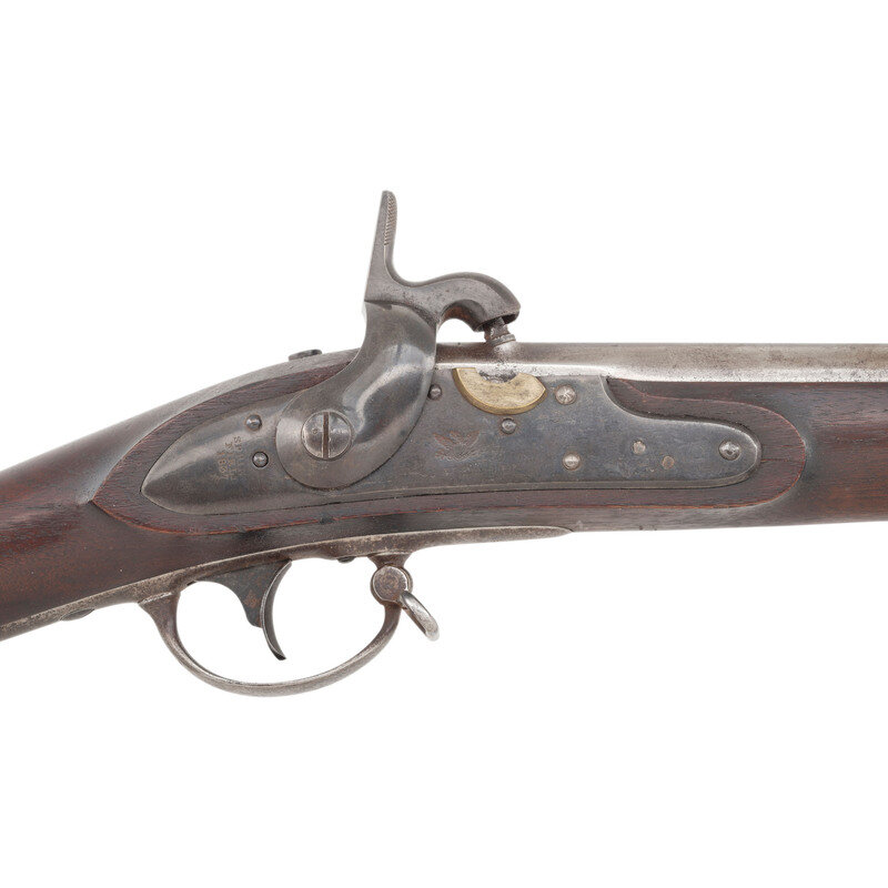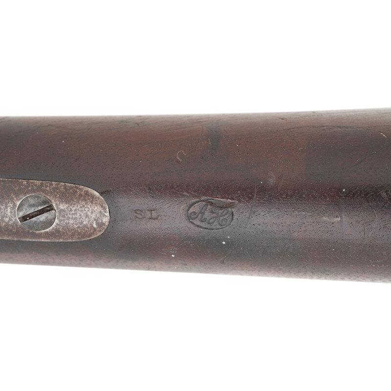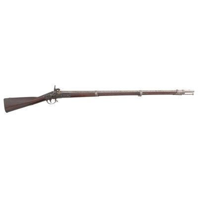 .69 caliber. 42" barrel secured by three flat, spring-retained barrel bands. NSN. Bright finish, color casehardened lock, iron furniture, walnut stock. Single shot percussion altered muzzleloading musket with no rear sight, brass blade front sight, sling swivels, socket bayonet lug and button head ramrod. Lock marked with a {Spread-Winged Eagle}/U.S. forward of the hammer and in three lines at the tail SPRING/FIELD/1837. Tang with matching 1837 date, breech with standard P/{Eagle Head}/V proof marks. Counterpane with two crisp script cartouches, the ET of Elisha Toby and the TW of Thomas Warner. The clear script AH final acceptance cartouche of Asahel Hubbard. A fine example of an arsenal converted US Model 1816 Type III musket. {ANTIQUE}