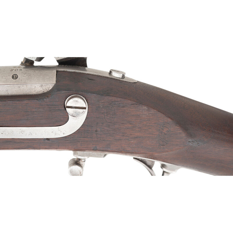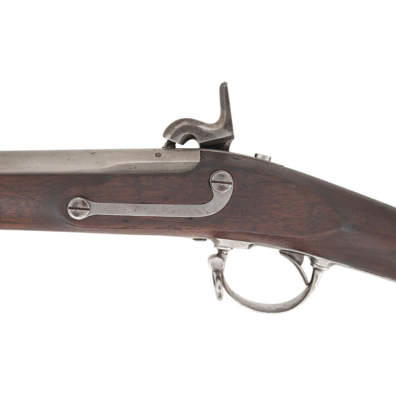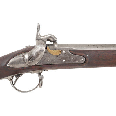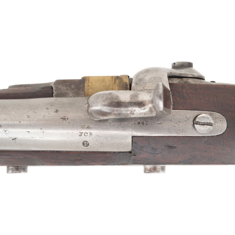 .69 caliber. 42" rifled barrel retained by three flat spring-retained bands. NSN. Bright finish, iron furniture, walnut stock. Single shot muzzleloading percussion altered musket. Lock marked with a {Spread-Winged Eagle}/L POMEROY forward of the hammer and 1844/US vertically in two lines at tail of lock. Barrel tang dated 1841 with US/JCB inspection marks at breech and correct Pomeroy contract raised P proof in a depressed starburst. Visible script NWP and WAT cartouches on counterpane, the marks of arsenal sub-inspector Nahum W Patch and Ordnance Officer William Anderson Thornton. Arsenal alteration from flint to percussion with the alphanumeric reassembly mating mark that appears to read I 16 on the stock comb. These mating marks are associated with percussion alterations performed at the Watervliet Arsenal. Bore is arsenal rifled with three lands and grooves, an upgrade performed after the percussion alteration. The barrel and lock/stock were likely mismatched at this point in time, as the Model 1840 musket was technically an "interchangeable parts" gun, although not always in practice. Retains correct pattern, full-length trumpet head ramrod with threads at end, face of rammer is correctly modified for elongated ball ammunition. Both sling swivels present. According to Moller only 681 cone-in-barrel altered US muskets were later rifled without the addition of rear sights circa 1858-1859. {ANTIQUE}