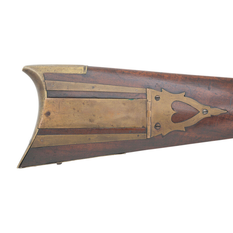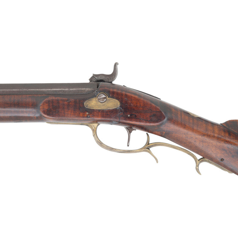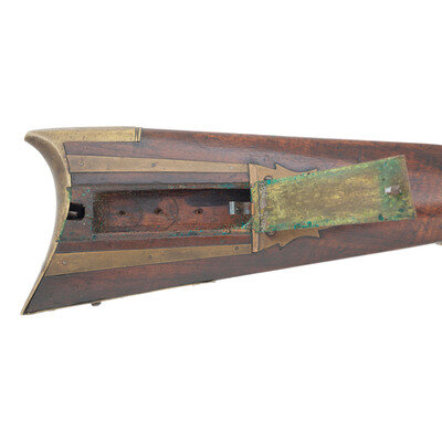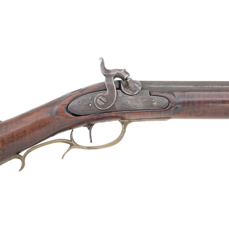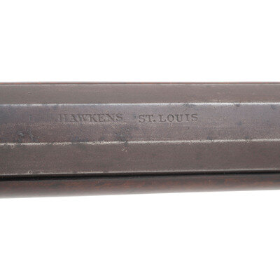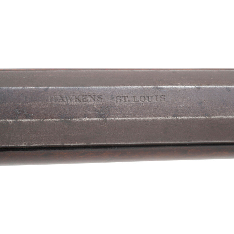 No name is more synonymous with the rifles of the great plains and pre-Civil War western expansion than that of Hawken. Jacob Hawken moved to St. Louis from Hagerstown Maryland in 1818 and was followed by his younger brother Samuel in 1822. Jacob had learned the trade of gun making from his father Christian and also spent time working at the US Arsenal at Harpers Ferry. Initially the Hawken brothers appear to have focused more on traditional gunsmithing and repairs in St. Louis than firearms manufacturing. The earliest guns they produced would have certainly been flintlocks with percussion guns not becoming typical until the early 1830s. Early St. Louis Hawken-marked percussion rifles were brass mounted full-stock guns that followed the general form of the Pennsylvania style rifles they would have produced in Hagerstown.