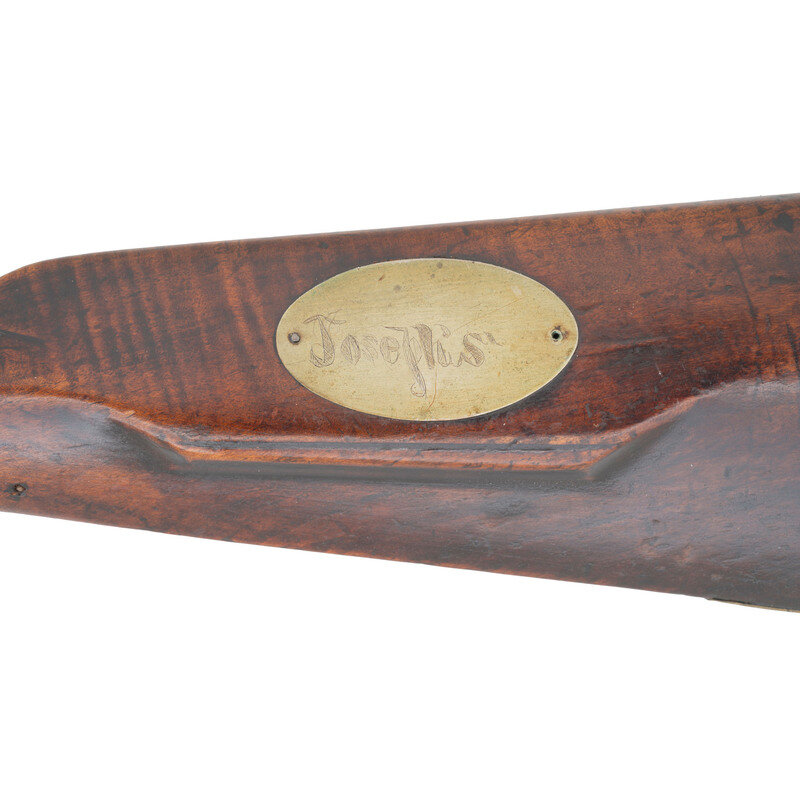 .56 caliber. 31" wedge retained octagonal barrel with single screw tang. NSN. Browned barrel, brass furniture, German silver decorations, full-length walnut stock with crescent butt. Single shot percussion muzzleloading rifle with fixed dovetailed rear sight, dovetailed German silver Rocky Mountain blade front sight. Commercial percussion lock retained by a single screw may be a replacement and is marked NORRIS & BEATTY in an arc over BALTIMORE. Top barrel flat correctly stamped J&S HAWKENS ST. LOUIS with the "J&S" mark weak and the "HAWKENS" and "ST. LOUIS" marks clear. Barrel and stock likely shortened at some point in time, with the 2" sheet brass forend cap being a replacement. Decorations include an oval German silver plate on the raised cheek rest that is engraved "Joseph's". A lozenge shaped German silver thumb plate and German silver wedge escutcheon are present as well. Single trigger, brass triggerguard with finger spur and grip extension, brass wedges. Four-piece brass patch box with cut out heart shaped mounting plate. While this may be a very early production J&S Hawken sporting rifle, It seems more likely that this gun was rebuilt in the period of use, reusing the J&S Hawken marked barrel and restocked as a shorter, handier rifle for handling and use on horseback. {ANTIQUE}