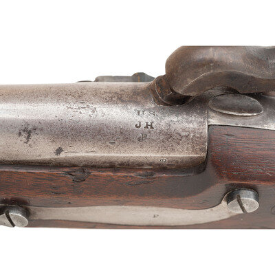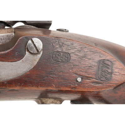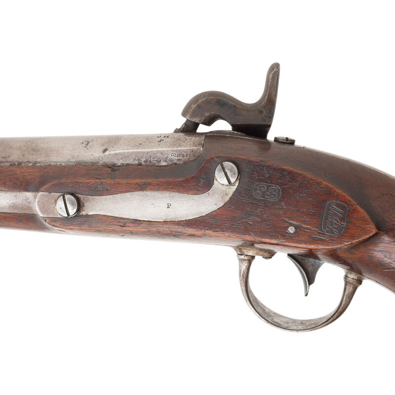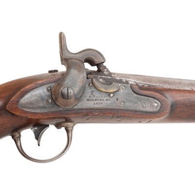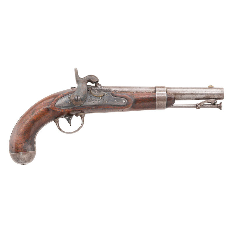 .54 caliber. 8.5" smoothbore barrel secured by a single barrel barrel band. NSN. Bright finish, color casehardened lock, steel mountings, walnut stock. Single shot muzzleloading smoothbore pistol altered from flint to percussion with captive swivel ramrod, fixed notch rear sight and brass blade front sight. Percussion altered lock is marked with an {Eagle Head} under the pan and in three lines: A WATERS/MILLBURY MS/1838. Breech with US/JH/P inspection marks. Counterpane with two clear script cartouches, the EB of Elizur Bates followed by the MPL of Ordnance Officer Mann Page Lomax. The US Model 1836 pistol was made in large quantities between 1837 and 1844 with some 41,000 being produced by two contractors, Robert Johnson and Asa Waters. Johnson produced slightly fewer of the guns at 18,000, with Waters producing the balance of 23,000. it was the last US military flintlock pistol and the standard pistol issued from the Seminole Wars through the Mexican American War. Thousands of the guns saw a second life during the American Civil War altered to percussion, like this example. {ANTIQUE}