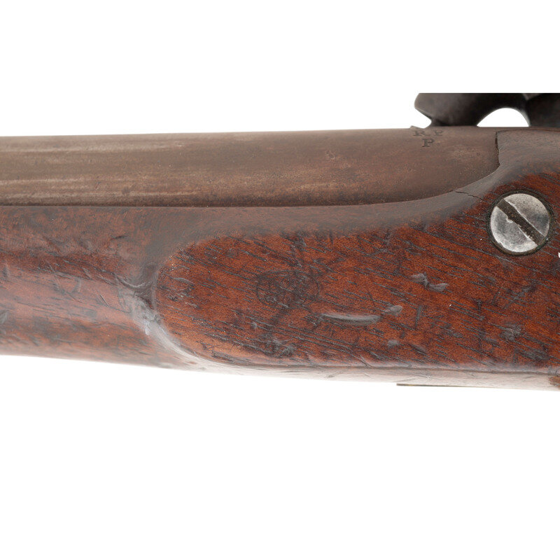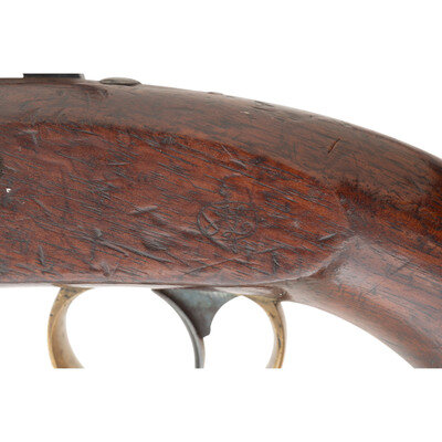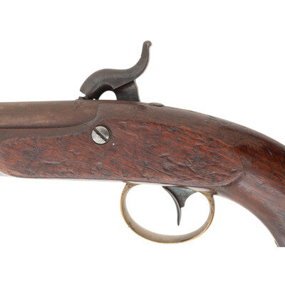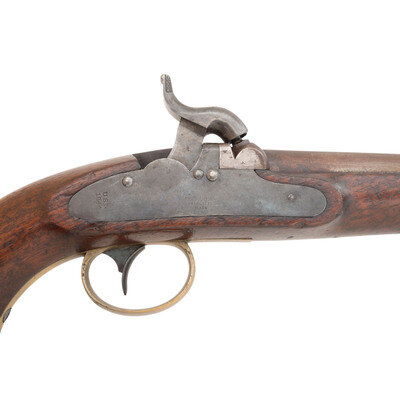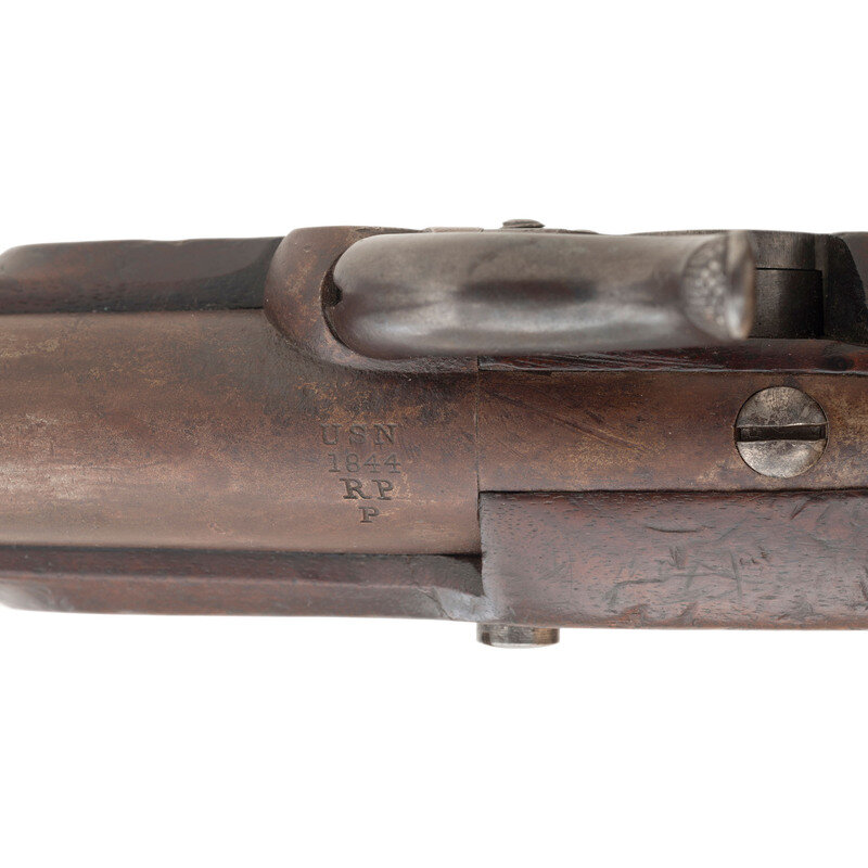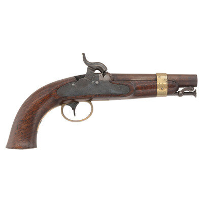 .54 caliber smoothbore. 6" barrel secured by a single pinned brass barrel band. NSN. Browned barrel, color casehardened lock, brass furniture, walnut stock. Single shot muzzleloading percussion pistol with inside hammer box lock action, captive swivel ramrod and brass post front sight. Lock marked in three lines: N.P. AMES/SPRINGFIELD/MASS under the hammer and vertically in two lines at the tail: USN/1844. Breech of barrel marked U.S.N./1844/JCB/P. Counterpane with a pari of script cartouches, including the JL of US Navy Lieutenant Joseph Lanman. Roughly 2,000 of these interesting US Navy contract pistols were produced by Ames circa 1842-1845. They remained in regular use until the adoption of the Colt Model 1851 Navy Revolver in the late 1850s, and for some time thereafter, as single shot pistols were phases out in the navy. A fairly uncommon US Navy handgun in very nice condition. {ANTIQUE}