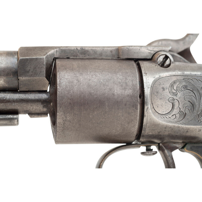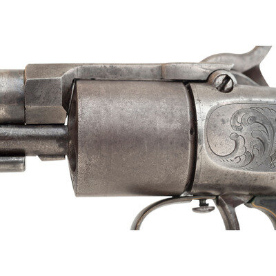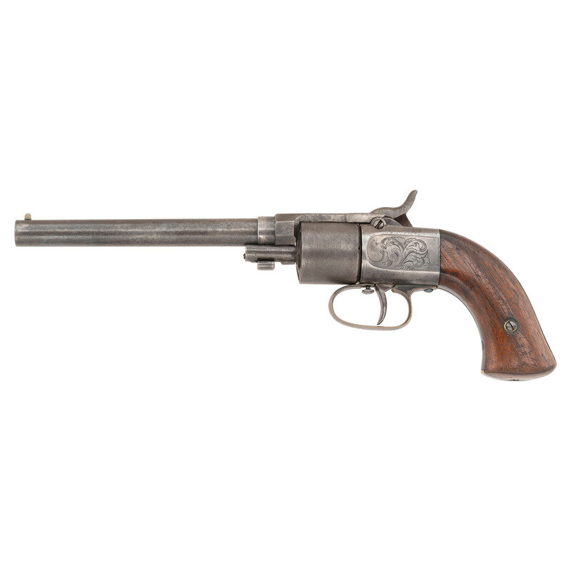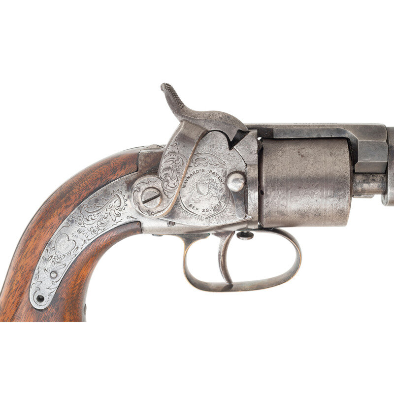 .31 caliber. 6" barrel length. SN: 726. Blued and color casehardened finish, silver plated brass triggerguard, smooth one-piece walnut grip. Manually indexed and rotated Maynard tape primed tip up percussion revolver with un-fluted six chambered cylinder, notch rear sight and German silver blade front sight. Primer magazine door engraved with an escutcheon and the words MAYNARD'S PATENT/SEP. 22, 1845 surrounding an {American Eagle}. Topstrap stamped MASS. ARMS CO./CHICOPEE FALLS in two lines. Cylinder acid etched with floral motifs, lock, hammer and reverse frame engraved with simple, flowing foliate scrolls. These guns were produced in relatively small quantities between 1851 and 1857 with an estimated production of about 1,000. The manually rotated cylinder design was intended to circumvent Colt's 1836 patent which covered the rotation and indexing of a revolver cylinder with the cocking action of the hammer. The addition of the automatic priming system was an attempt to make a gun that was not as sophisticated or conventional as the Colt have some additional market appeal. In 1857 the abolitionist John Brown purchased 200 of these guns for his planned uprising, resulting in collectors referring to this revolver as the John Brown Model. A scarce revolver from the pre-Civil War period. {ANTIQUE}