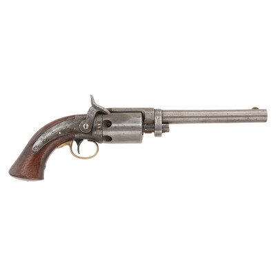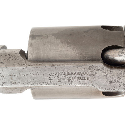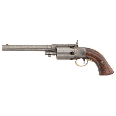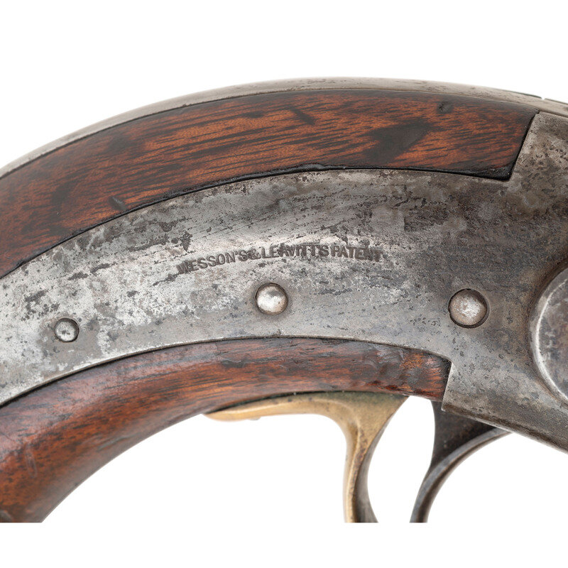 .40 caliber, 7.25" round barrel, SN: 205. Blued and color case hardened finish, brass triggerguard, smooth walnut grip. Single action percussion revolver with tip up hinged frame, six-chambered un-fluted cylinder, fixed notch rear sight and brass blade front sight. Top strap marked MASS ARMS CO/CHICOPEE FALLS, lock marked WESSON'S & LEAVITT'S PATENT. Face of frame numbered 205, no other numbers noted. Face of cylinder rotating ring with patent date information. Only about 800 of these large frame, medium bore percussion holster revolvers were produced circa 1850-1851. {ANTIQUE}