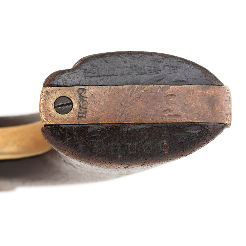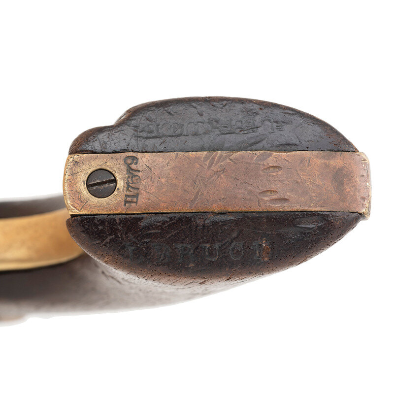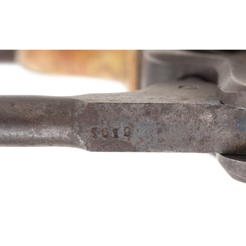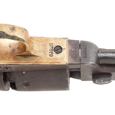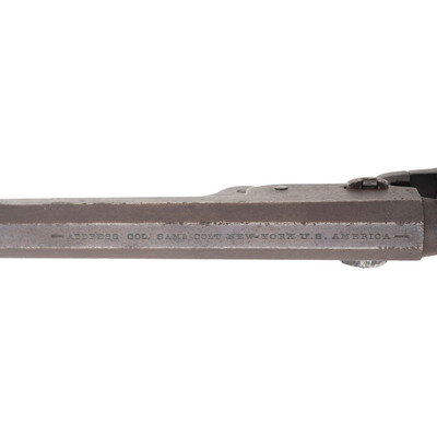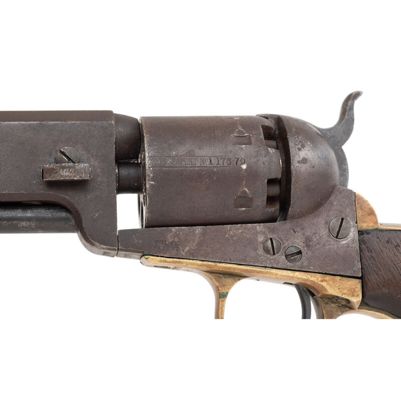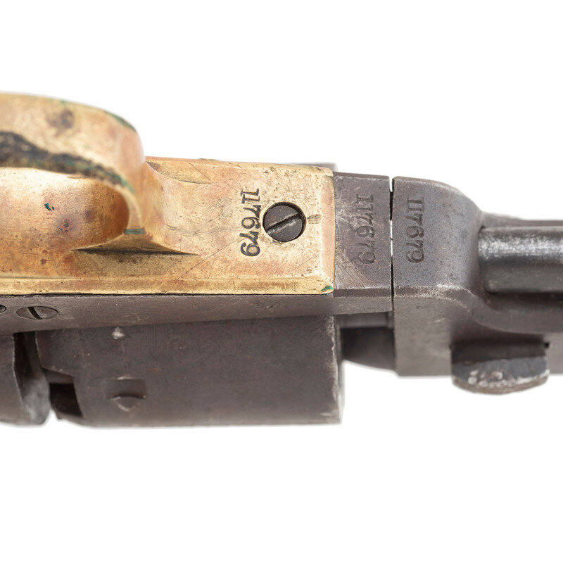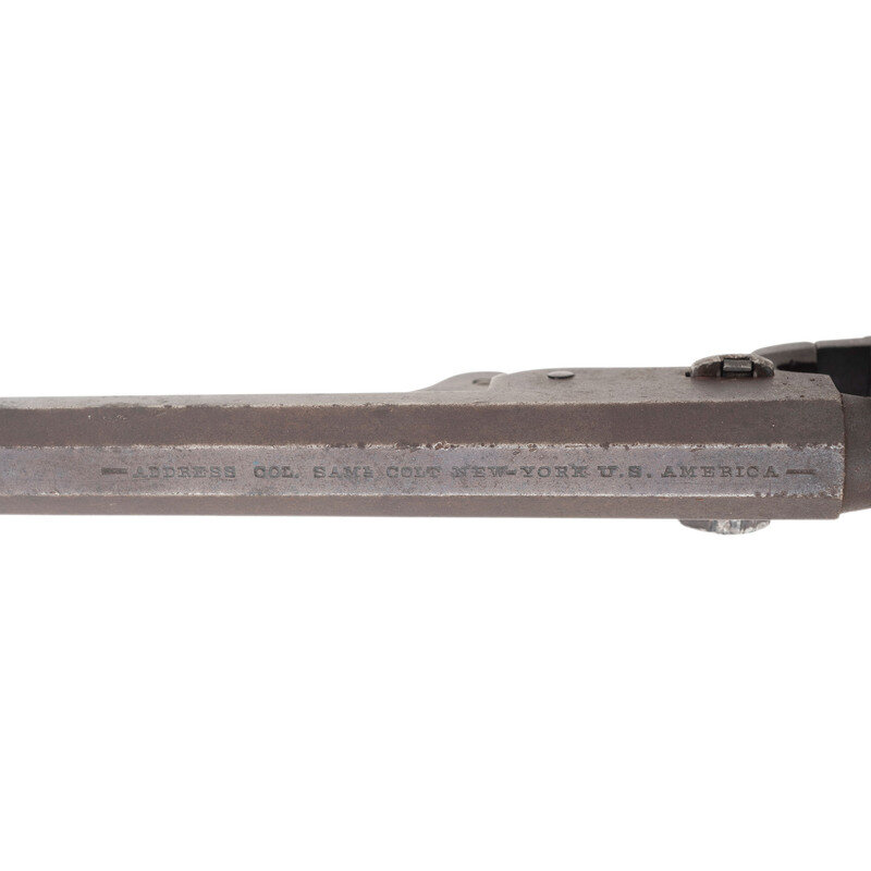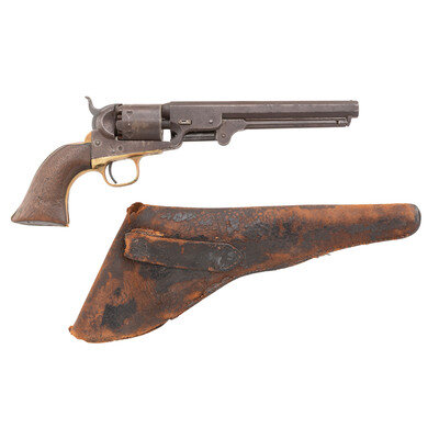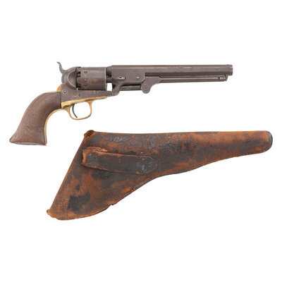 .36 caliber. 7.375" octagonal barrel. SN: 117679 (mfg. ca. 1861). Blued and color casehardened finish, brass backstrap and triggerguard, one-piece smooth walnut grip. Single action percussion revolver with toggle link loading lever, six-chambered unfluted cylinder, hammer nose notch rear sight and brass post front sight. Barrel with one-line New York U.S. America address, lower left of frame with COLT'S/PATENT mark. All visible serial number match, including the wedge. Cylinder with weak markings and only traces of scene. An only partially legible name is in the bottom of the grip of the pistol. Includes a period leather holster that shows heavy wear and finish loss.