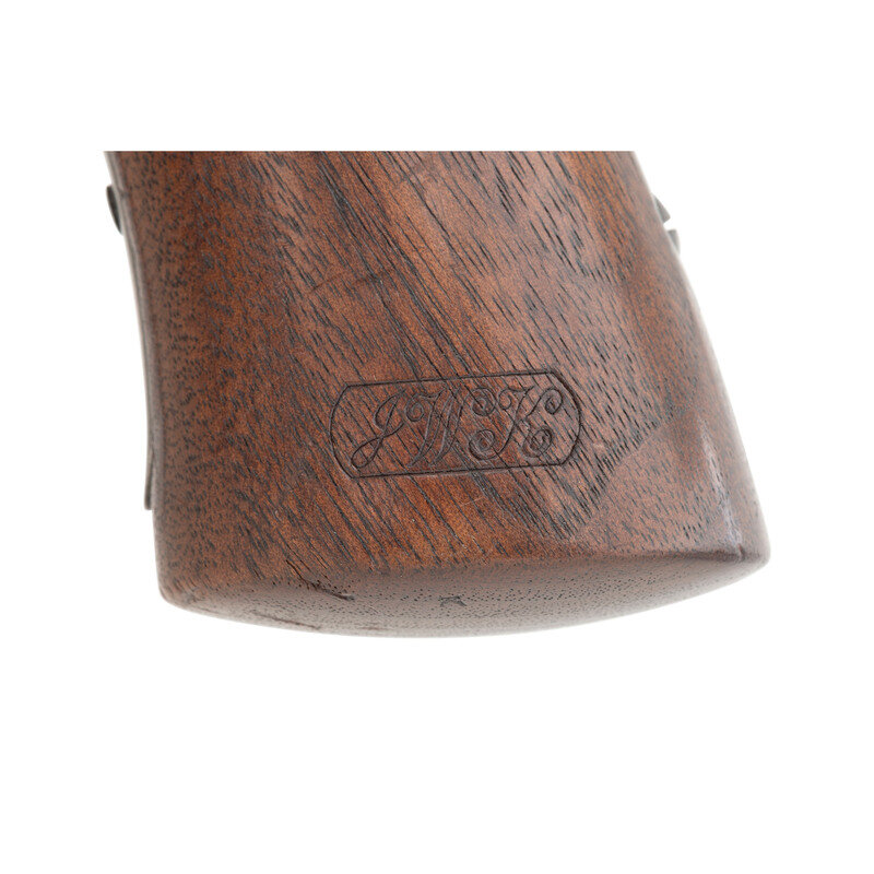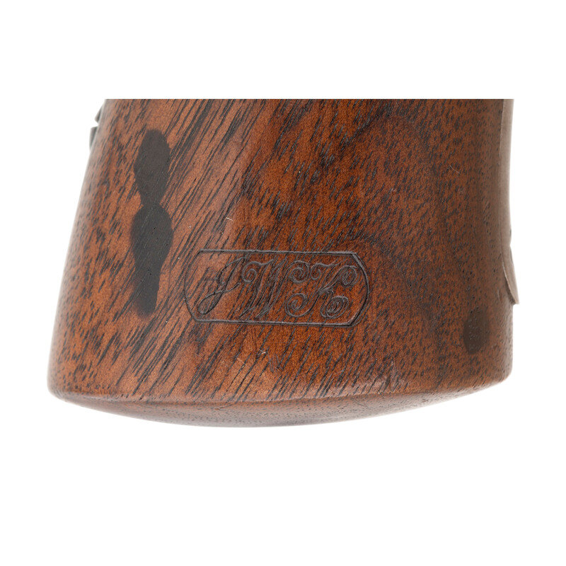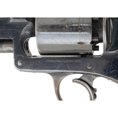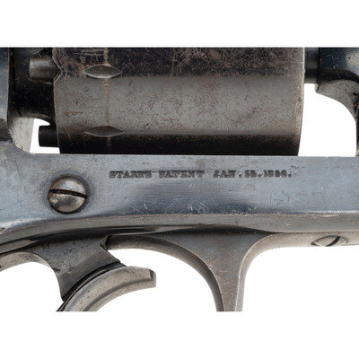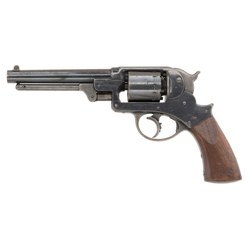 .44 caliber. 6" barrel. SN: 7239. Blued and color casehardened finish, smooth one-piece walnut grip. Double action percussion revolver with 6-chambered un-fluted cylinder, tip down barrel, hammer nose notch rear sight and dovetailed blade front sight. Lower left of frame marked STARR ARMS CO. NEW YORK and lower right side marked STARR'S PATENT JAN. 15. 1856. Sub-inspection marks throughout. Marching serial numbers on lower front of frame, in hammer cut in upper frame and on cylinder. Grip with a clear script cartouche on each side, the JWK of arsenal sub-inspector John W Keene. {ANTIQUE}