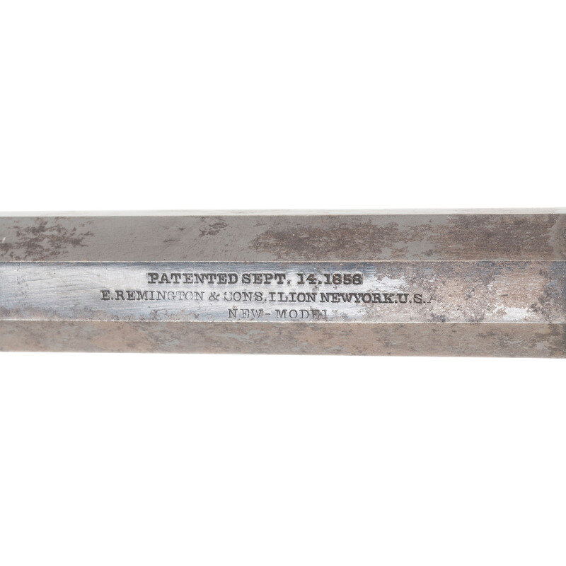 .36" Caliber. 7.375" octagonal barrel. SN: 35973. Blued finish, color casehardened hammer, silver plated brass triggerguard, two piece varnished smooth walnut grips. Single action solid frame percussion revolver with an un-fluted six-chambered cylinder, topstrap groove rear sight, iron blade front sight and pivoting loading lever. The top of the barrel roll marked in three lines: PATENTED SEPT. 14. 1858/E. REMINGTON & SONS. ILION NEW YORK U.S.A./NEW MODEL. Matching numbers on left of frame under grip, under barrel and in pencil in both grips. {ANTIQUE}