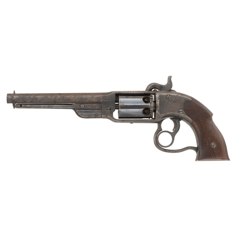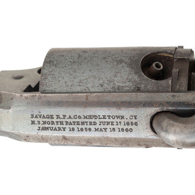 .36 caliber. 7.125" octagonal barrel. SN: 969. Blued and color casehardened finish, two-piece smooth walnut grips. Ring cocking action percussion gas seal revolver with six-chambered un-fluted cylinder, fixed notch rear sight and tall brass cone front sight. Top strap marked clearly in three lines: SAVAGE R.F.A.CO. MIDDLETOWN, CT./H.S. NORTH PATENTED JUNE 17, 1856/JANUARY 18, 1859 MAY 15, 1860. Serial number on right of frame under grip with matching assembly number 77 on grip frame, under barrel where it is concealed by the loading lever and in the grips. The revolver was not further disassembled. The revolver has H and P military inspection or sub-inspection marks on the barrel but no other inspection marks are noted. A really fine and crisp example of a gun that is hard to find with any kind of condition at all. {ANTIQUE}