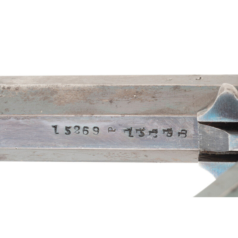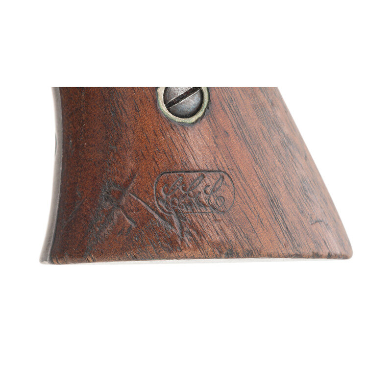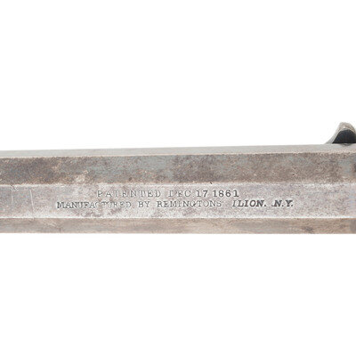 .36 caliber. 7.375" octagonal barrel. SN: 15269. Blued finish, color casehardened hammer, brass triggerguard, smooth two-piece walnut grips. Single action percussion revolver with solid frame, unfluted six-chambered cylinder without safety notches at the rear, high spur hammer, German silver cone front sight and unmodified Elliot's patent loading lever groove without the modification screw added. Two-line barrel address with Elliot patent date reads PATENTED DEC. 17, 1861/MANUFACTURED BY REMINGTONS' ILION, N.Y. "J" and "C" sub-inspections on many of the metal parts, a clear script CGC cartouche is present on the left grip. Matching serial number on grip frame under grips and under barrel, with an original barrel serial number marked out at the factory. Both grips are very lightly pencil numbered to the gun, cylinder is not numbered, which is not uncommon. A very nice and crisp martial Remington Navy revolver. {ANTIQUE}