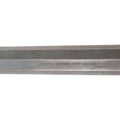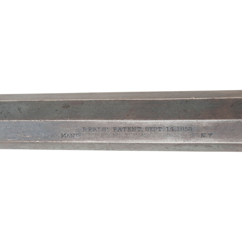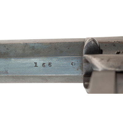 .44 caliber. 8" octagonal barrel. SN: 166. Blued finish, color casehardened hammer and loading lever, brass triggerguard, German silver grip screw escutcheons and smooth two-piece walnut grips. Single action percussion revolver with un-fluted six-chambered cylinder, top strap groove rear sight and dovetailed German silver cone front sight. Top of barrel marked in two lines BEALS' PATENT SEPT. 14, 1858/MANUFACTURED BY REMINGTONS' ILION, NY. with the second line somewhat weak due to a poor die strike or worn die. Matching serial numbers on right of frame under grip and under barrel, loading lever and cylinder are not numbered, as is typical of these guns. Grips unnumbered but fit perfectly. Only about 1,900 of the first of the solid frame Remington Army revolvers were produced circa 1861-1862 with 50%-80% being acquired by the US Government for Civil War military service. This gun is not martially marked but may have been acquired on the open market as some were, and those guns did not receive inspection marks. A search of the Springfield Research Service serial number books did not find this gun, but the two closest ones were #153 which was issued to Company I of the 5th Illinois Cavalry and #175 which was issued to Company E of the 19th New York Cavalry. A nice example of a scarce, early Remington Army revolver. {ANTIQUE}