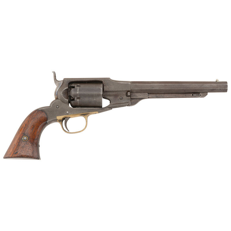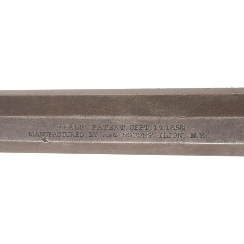 .36 caliber. 7.5" octagonal barrel. SN: 991. Blued finish, color casehardened hammer, brass triggerguard, two-piece smooth walnut grips. Single action percussion revolver with un-fluted six-chambered cylinder, topstrap groove rear sight and German silver cone front sight. Two line Beals' patent marking that reads BEALS' PATENT SEPT. 14, 1858/MANUFACTURED BY REMINGTON'S ILION, NY. Matching serial numbers under barrel and on lower left of grip frame under grips and in weak pencil in the grips. Cylinder unnumbered but marked on the rear face with three punch dots as a mating mark, with three dots on the cylinder arbor as well. {ANTIQUE}