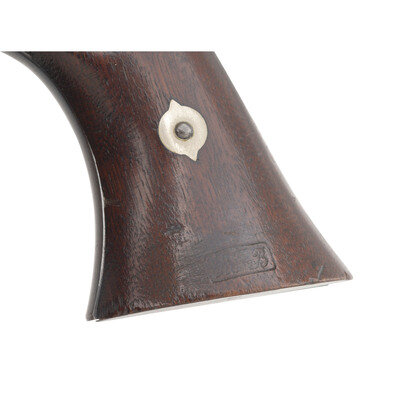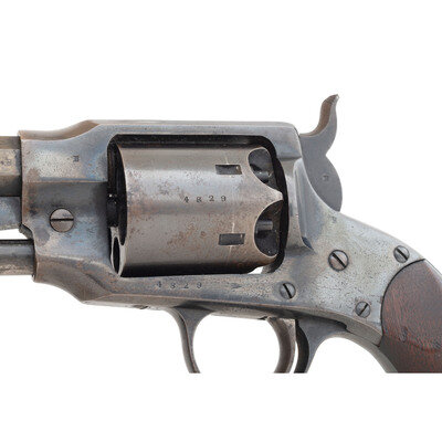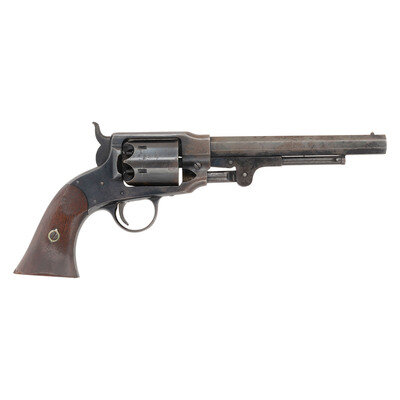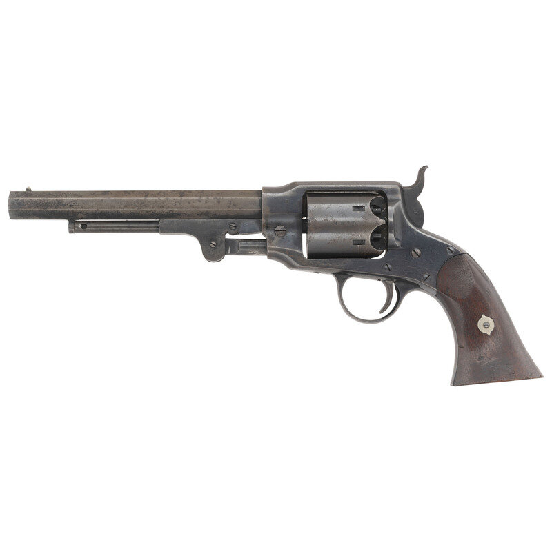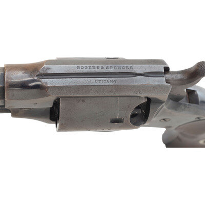.44 caliber. 7.5" octagonal barrel length. SN: 4829. Blued finish, smooth walnut grips. Single-action solid frame percussion revolver with un-fluted six-chambered cylinder, loading lever, and fixed notch frame rear sight and German silver cone front sight. Topstrap marked ROGERS & SPENCER and UTICA N-Y on either side of the sighting groove. Matching serial numbers on lower left side of frame, on butt, on side of cylinder, on top flat of loading lever and inside both grips. Barrel serial number is mismatched, and is 4799. A soft script RPB cartouche, the mark of arsenal sub-inspector Robert P Beals is present on the left grip. Single letter sub-inspection marks are present on many of the components of the gun. The Rogers & Spencer was the pinnacle of percussion revolver design, but the 5,000 guns ordered by the Ordnance Department were only starting to be delivered in early 1865 as the Civil War was winding down. Only 1,500 guns were delivered prior to the cessation of hostilities and none were issued for field service. The guns were subsequently sold off at auction as surplus. A solid example of the last of the Civil War percussion revolver contracts and a gun that book ends any Civil War revolver collection. {ANTIQUE}