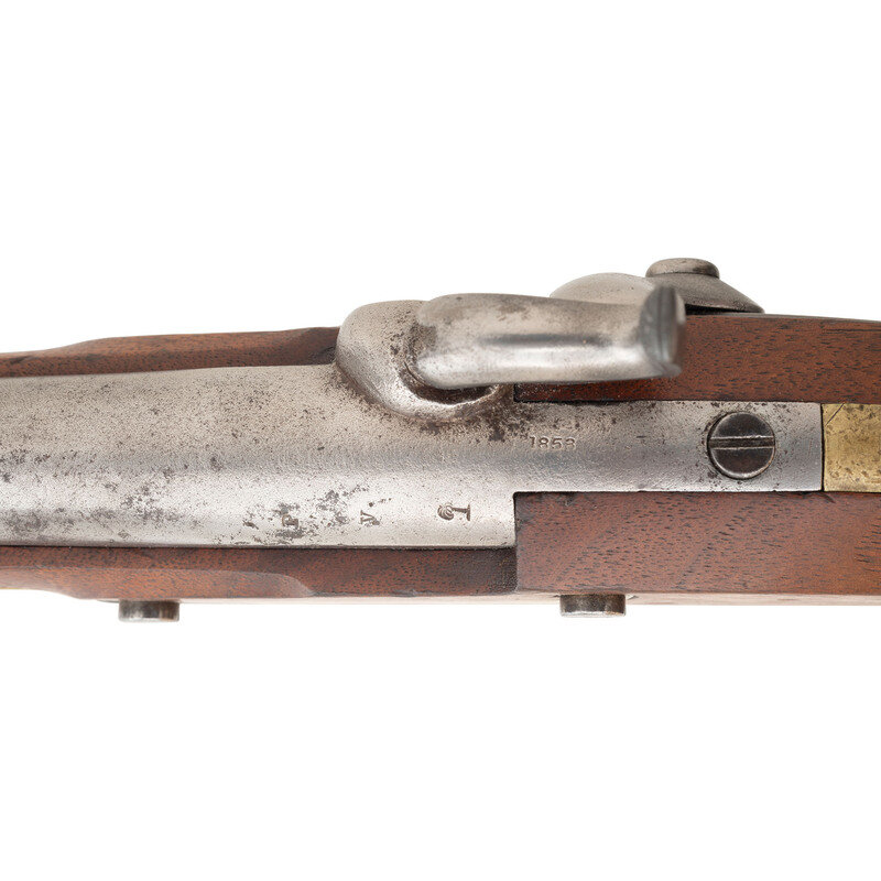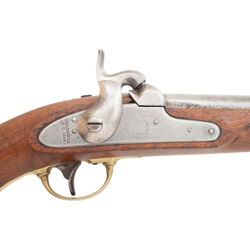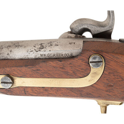 .54 caliber. 8.5" round barrel. NSN. Browned finish, polished color casehardened lock, brass furniture, walnut stock. Single shot percussion ignition muzzleloading smoothbore pistol with captive swivel ramrod. Lock markigns somewhat weak but with the correct Palmetto tree design in the center over the letters S.C. with the words PALMETTO ARMORY in an arc over the tree. The words have the correctly attached serifs in the right locations and the tree has the correct lower right frond touching the trunk which is correctly hatched in a single direction diagonally in the correct way. The tail of the lock is correctly marked COLUMBIA/S.C. 1852 in two vertical lines. The lock shows some minor forging flaws on its face, flaws in workmanship are not an uncommon feature with this guns. The breech plug tang is correctly dated 1853, with the left breech flat of the barrel is correctly marked Wm GLAZE & CO above the stock line. The breech has a clear set of inspection marks consisting of a P over V over {Palmetto Tree}. There is a large punch mark under the bolster on the barrel, below the stock line where the expected and often encountered condemnation "C" mark has been intentionally defaced to make it less obvious, likely something done during the assembly process by Glaze, as he used a number of condemned parts to produce the pistols for this contract. The pistol retains its original brass front sight blade and original captive ramrod.