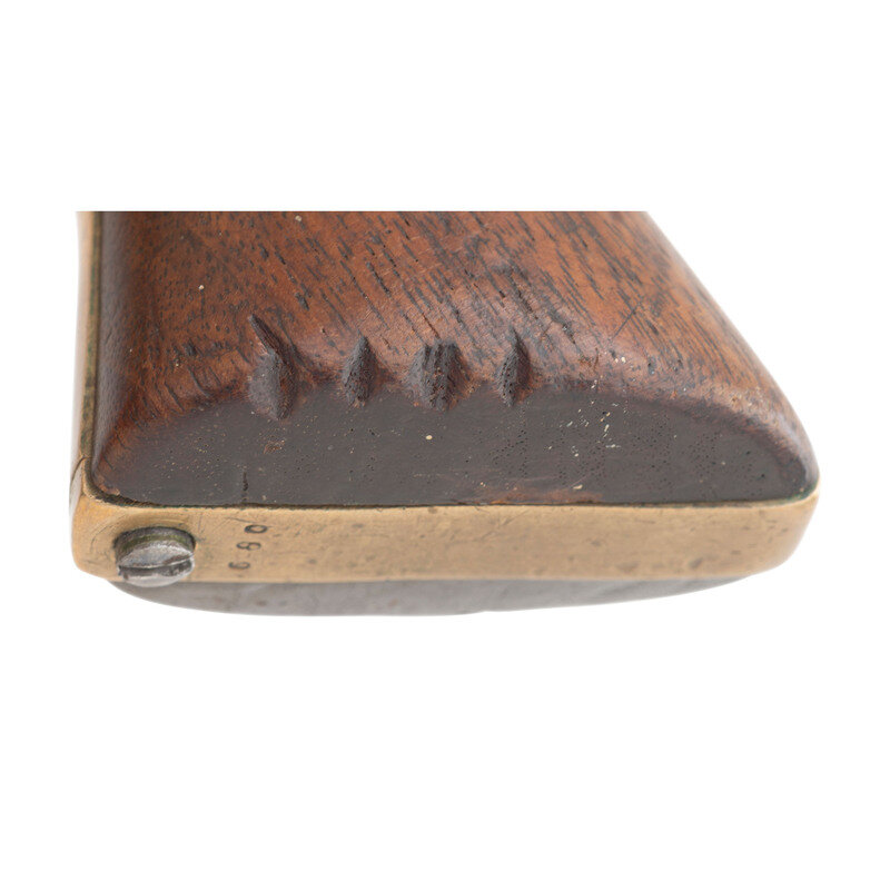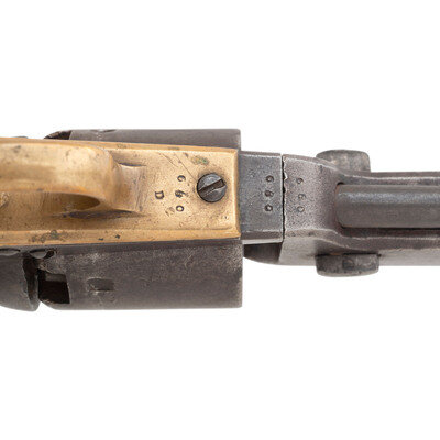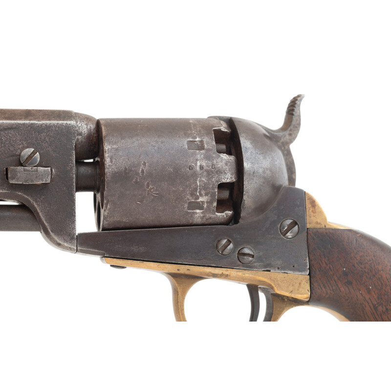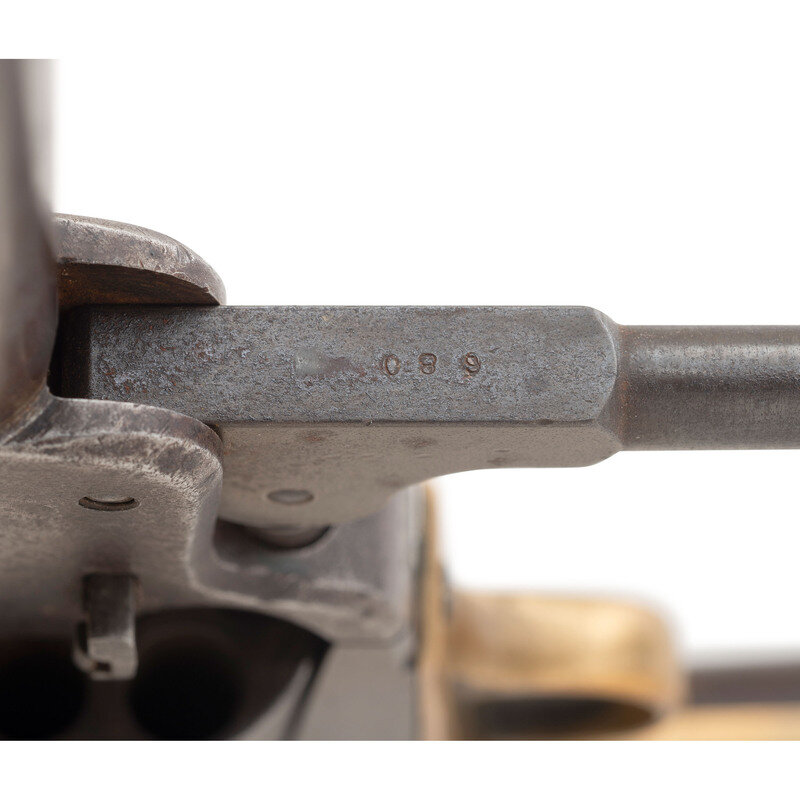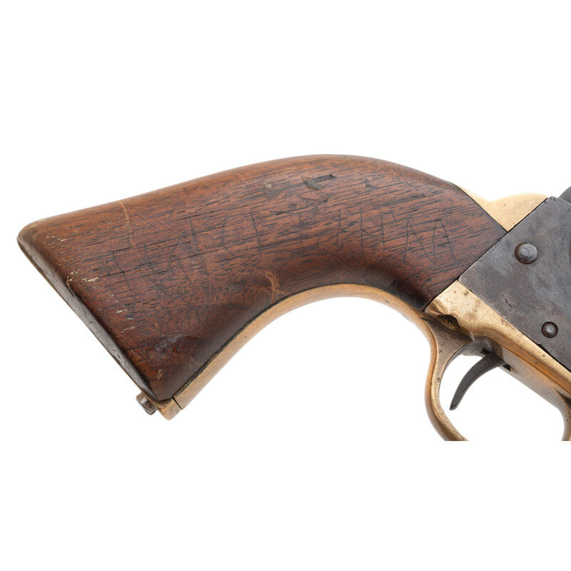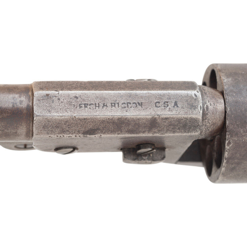 .36 caliber. 7.5" octagon to round barrel. SN: 680. Oxidized metal, brass triggerguard and blackstrap, one-piece smooth walnut grip. Confederate made copy of a Colt Model 1851 Navy single action percussion revolver with a six-chambered, un-fluted cylinder, hammer nose notch rear sight and brass post front sight. Top flat of barrel marked in a single line LEECH & RIGDON CSA. Matching serial numbers are found on bottom of barrel web, on the wedge, on the bottom of frame, on the bottom of the triggerguard, on butt and on the cylinder. The loading lever has been numbered to match as well. A small cryptic D is also present on the triggerguard. The left side of the grip has four distinct "kill" notches cut deeply into the lower edge and a name is lightly scratched on the right side of the grip that is only partially legible and appears to read W H PED???. This revolver was previously part of the Will Hoffield Collection, and was sold by Rock Island Auctions on December 6, 2008. At that time, the barrel was period cut to 3.75" barrel with no loading lever present. The revolver was subsequently restored with the entire round portion of the barrel being added since 2008, the barrel probably lined, and a loading lever was added. During the restoration an incorrect pattern of loading lever catch for this serial number range was installed as well. Only about 1,500 revolvers were produced by Leech & Rigdon in Columbus, MS and Greensboro, GA between 1863 and 1864, making them a rare Confederate handgun. Although restored to its original full-length barrel configuration, the gun still displays very well and is an opportunity to own a Leech & Rigdon revolver for significantly less than the normal $20,000 to $30,000 selling price for these rare guns.