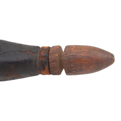 The survival rate of accoutrements that used tarred canvas in their production is exceedingly small and to date this cataloguer is only aware of two companies that produced accoutrements of this pattern for the Confederacy during the Civil War. Both were based in Columbus, GA and both produced these accoutrements circa 1863-1864. Other than N Crown & Co., William Brands & Co. also produced these accoutrements. Based on the best available research, the William Brands produced accoutrements are unmarked and Brands used a lead finial for their bayonet scabbard tips, while Crown used a turned wood finial for theirs. As noted, this scabbard uses a turned wooden finial tip.