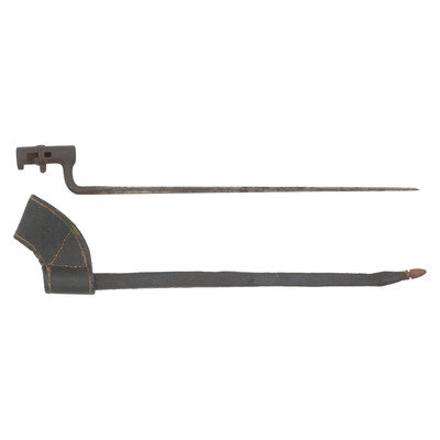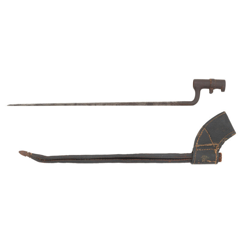 19.25" in overall length with a crescent shaped, sewn only belt frog that is nominally 5" in length and 2.5" wide. The scabbard terminates with a 1.125" turned wood finial. The scabbard is Confederate made copy of a US sewn-only Pattern of 1857 bayonet scabbard. It was manufactured with a sewn leather body, a sewn tarred canvas (oil cloth) belt frog and a turned wooden finial at the base of the scabbard body. Period terminology typically referred to tarred canvas as “oil cloth” and it was regularly used as an inexpensive waterproof cloth for the production of things like haversacks and rain gear. As the war progressed and the availability of raw materials like tanned leather became scarcer, the Confederacy experimented with “oil cloth” as an ersatz replacement for leather. The obverse of the tarred canvas frog is stamped with the N Crown & Company makers mark, which appears to read in two lines: N CROWN & Co/COLUMBUS GEO. While it is not clear, the initial “N” is present prior to the name “Crown”. The scabbard currently contains an attic condition US Model 1855 socket bayonet, which is as likely to have been carried in the scabbard as an imported English Pattern 1853 Enfield rifle musket socket bayonet and far more likely to have been used by the average Confederate infantryman than any of the small number of socket bayonets produced in the south by Richmond Arsenal or contractors like Heck & Brody in North Carolina.