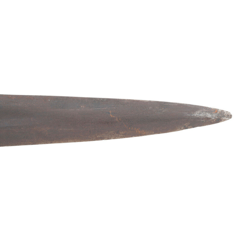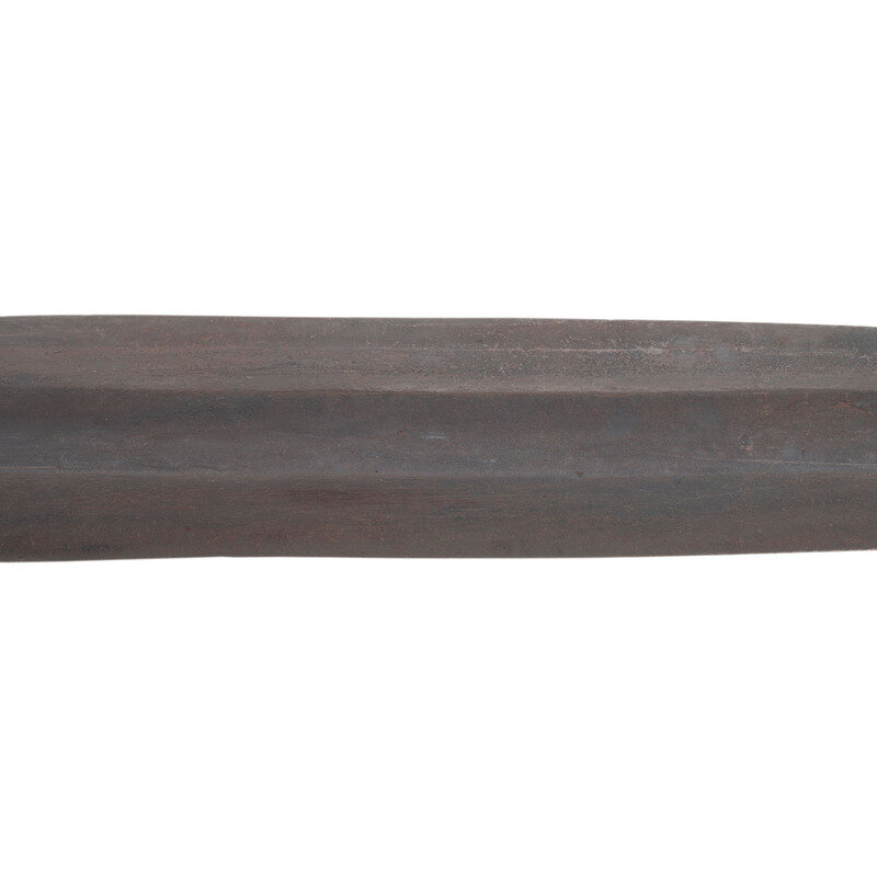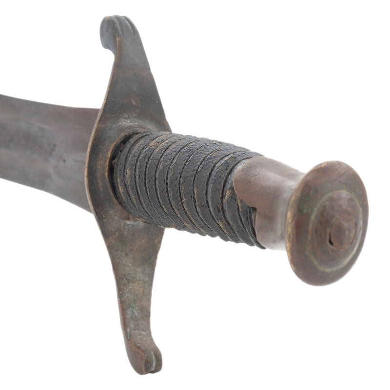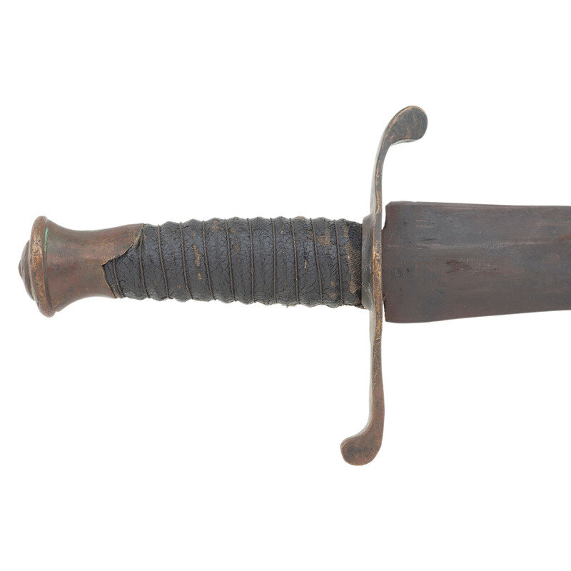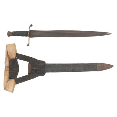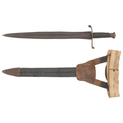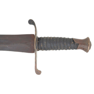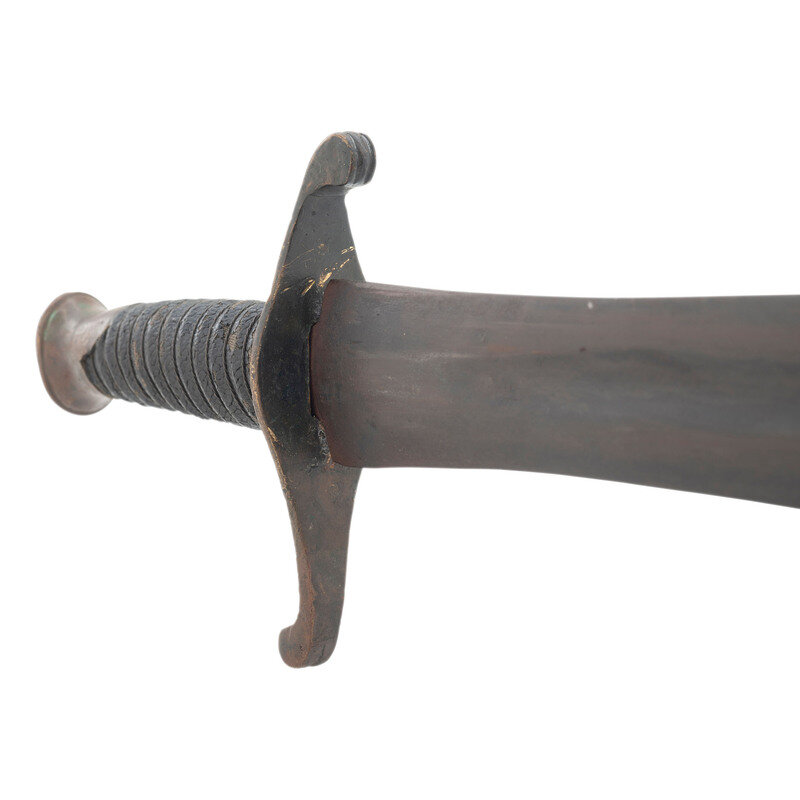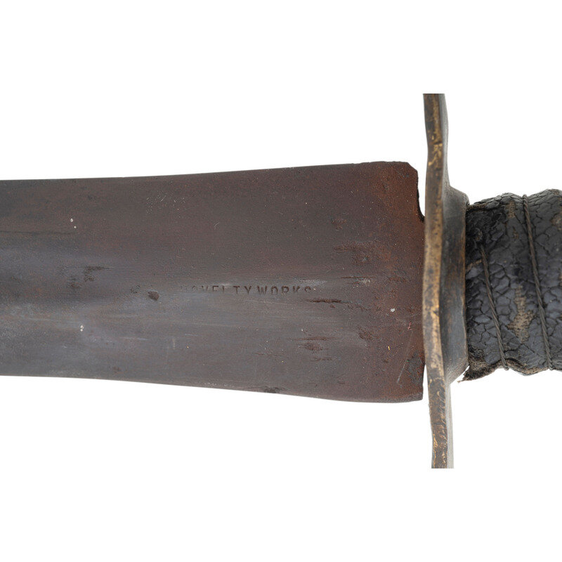 18" wasp waisted blade, with 11.5" central fuller, 1.65" wide at ricasso. Overall length 22.75" with a 4.75" hilt. 5" cast brass rudimental S-guard with grooved quillons, brass sword pommel cap. Cord wrapped wooden grip with leather covering and twisted iron wire. Blade with spurious NOVELTY WORKS mark on reverse, near ricasso. Includes a tin mounted leather scabbard with a belt made from the frog portion of a US Pattern 1832 Heavy Artillery belt and the belt from woven cotton with a simple German silver buckle.