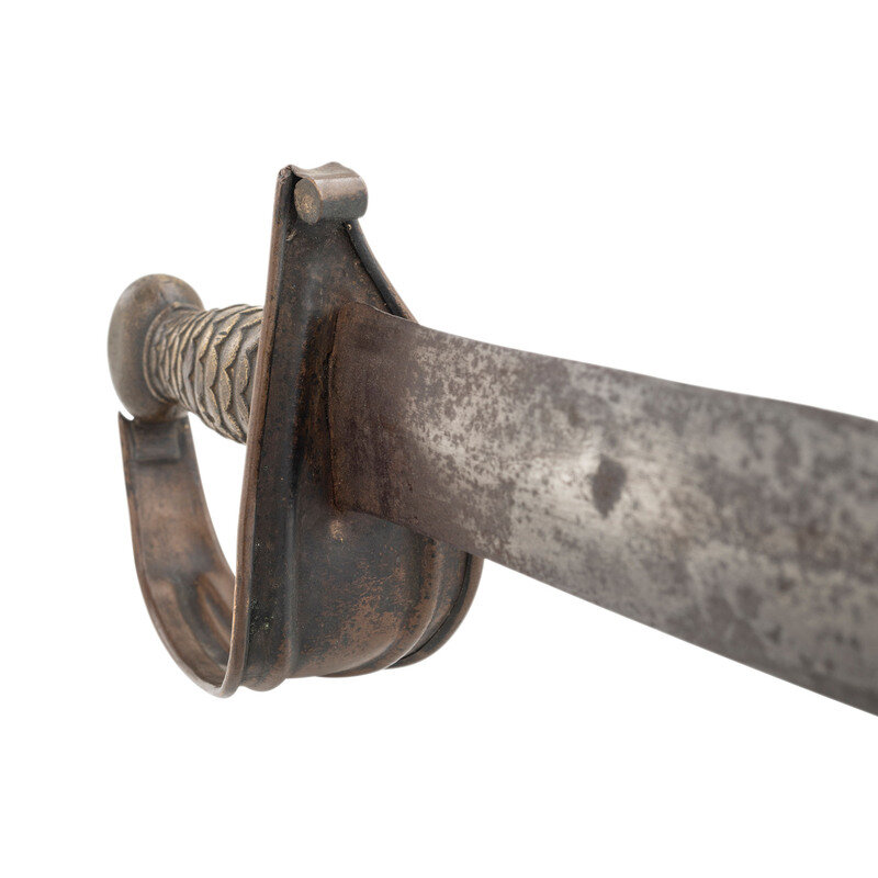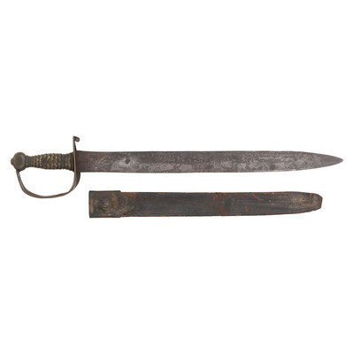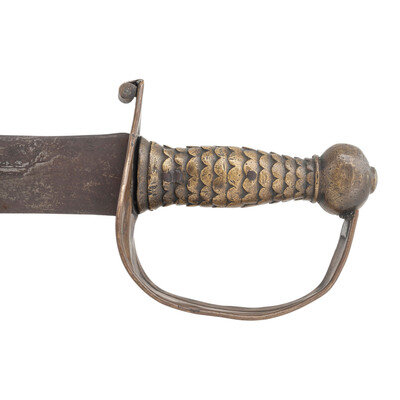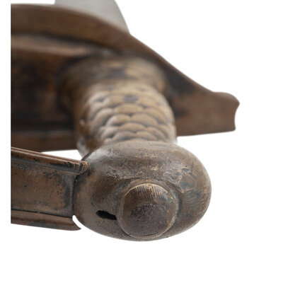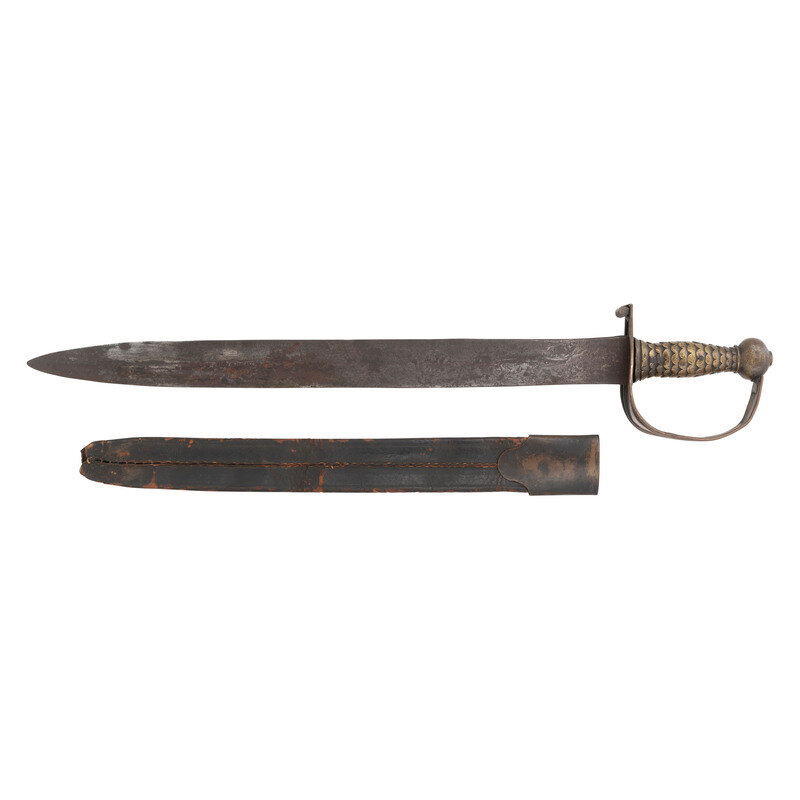 21.5" semi-wasp waisted double edged blade with subtle median ridge. Blade 1.75" wide at ricasso. Overall length 26.75". 5.25" sand cast brass hilt with fish scale grip and sheet brass half basket guard with rolled quillon at top. Cutlass is accompanied by an old brass mounted leather scabbard with a seamed brass throat with frog button. No drag is present.