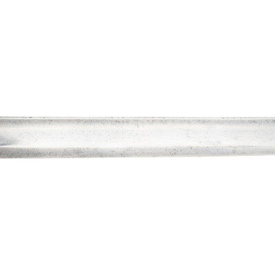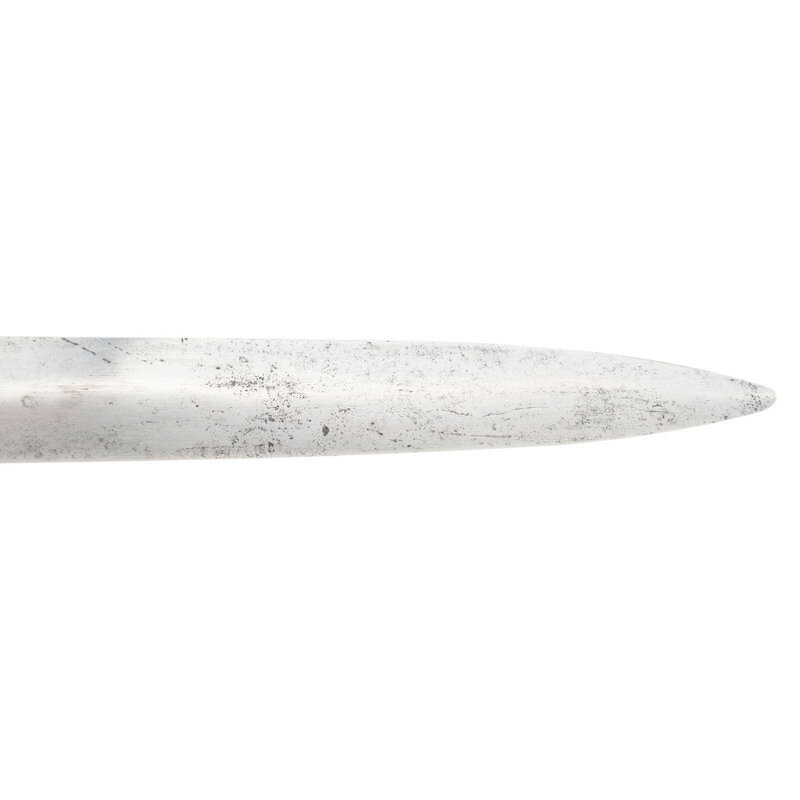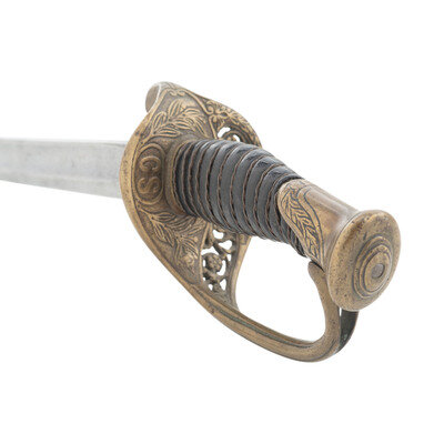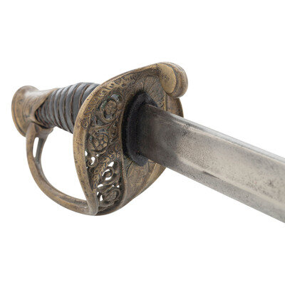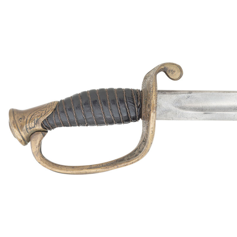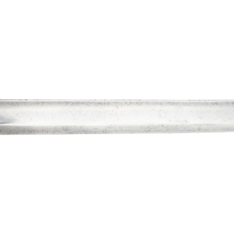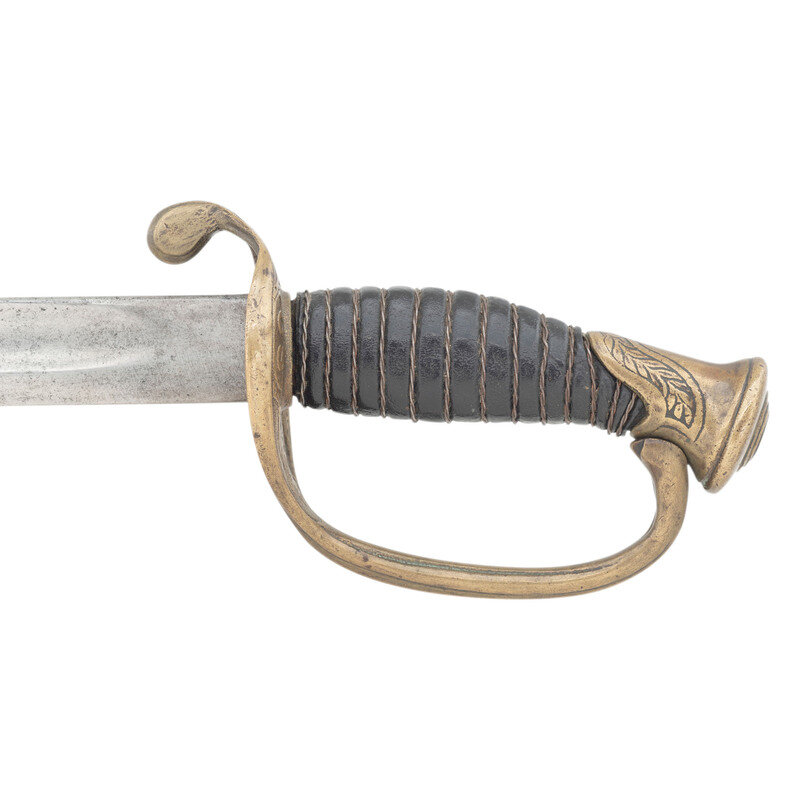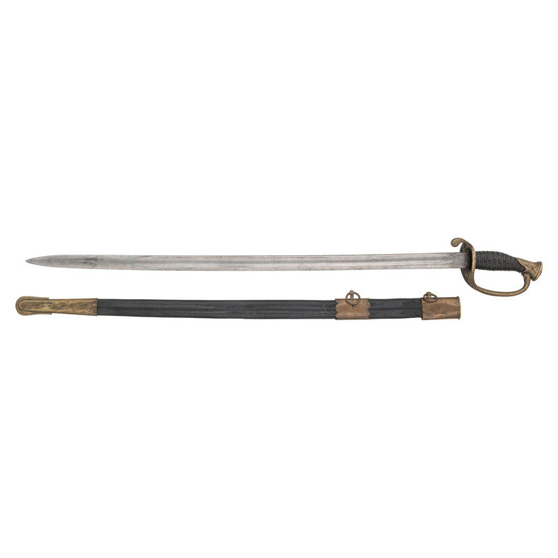 31.75" single edged, spear point blade with 23.25" unstopped fuller. Blade 1.17" wide at ricasso. Overall length 37.25" 5.5" hilt with cast brass guard decorated with foliate themes and with a raised cast CS in an oval on the inside face of the guard. Leather covered wood grip with pronounced palm swell and 14 wraps of twisted iron wire. Blade unmarked with some forging flaws. The sword is accompanied by a brass mounted leather scabbard that appears to be composite with three mismatched mounts.