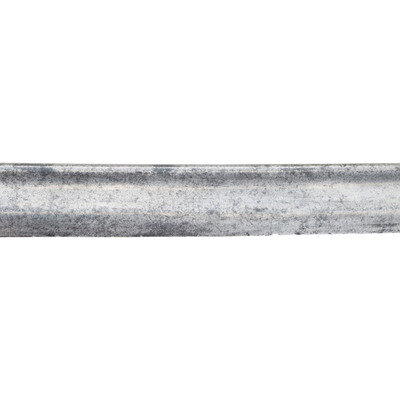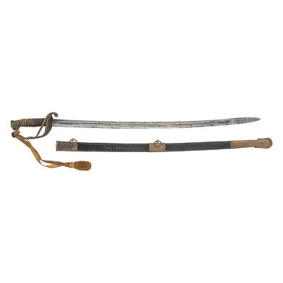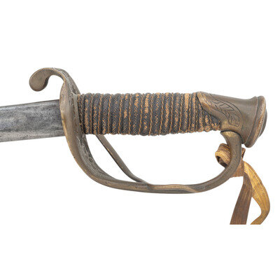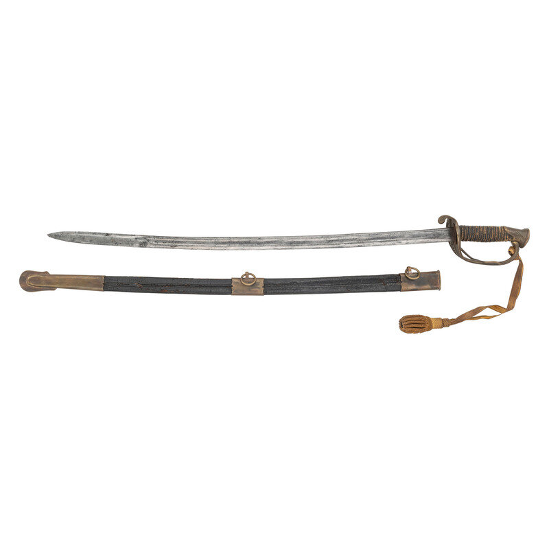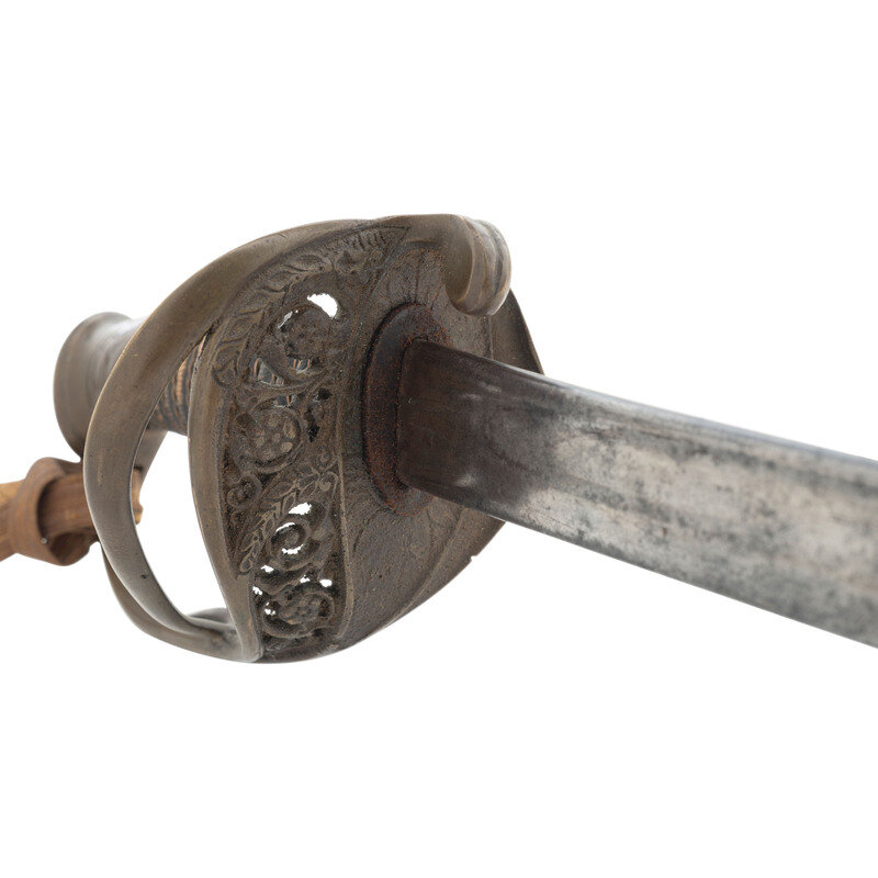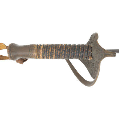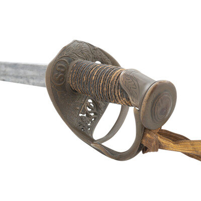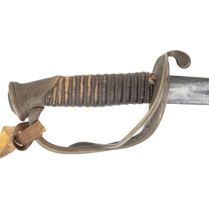 29.25" single edged spear point blade with 22.25" unstopped median fuller, blade 1" wide at ricasso. Overall length 34.75". 5.5" hilt with sand cast brass guard decorated with foliate theme and an extra knuckle bow branch. A raised CS in an oral is cast into th inside face of the grip. Wood grip with cord wrap and oil cloth covering and 16 wraps of twisted wire. An old gold bullion saber knot has been added to the sword. It is accompanied by a brass mounted leather scabbard with impressed X shaped decorations on the front.