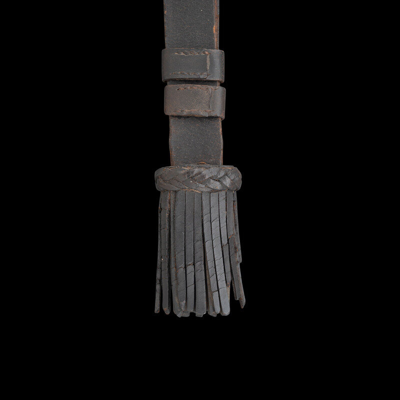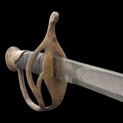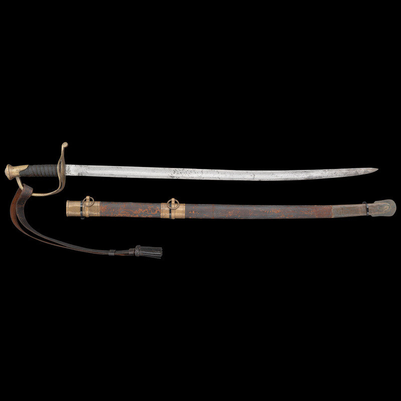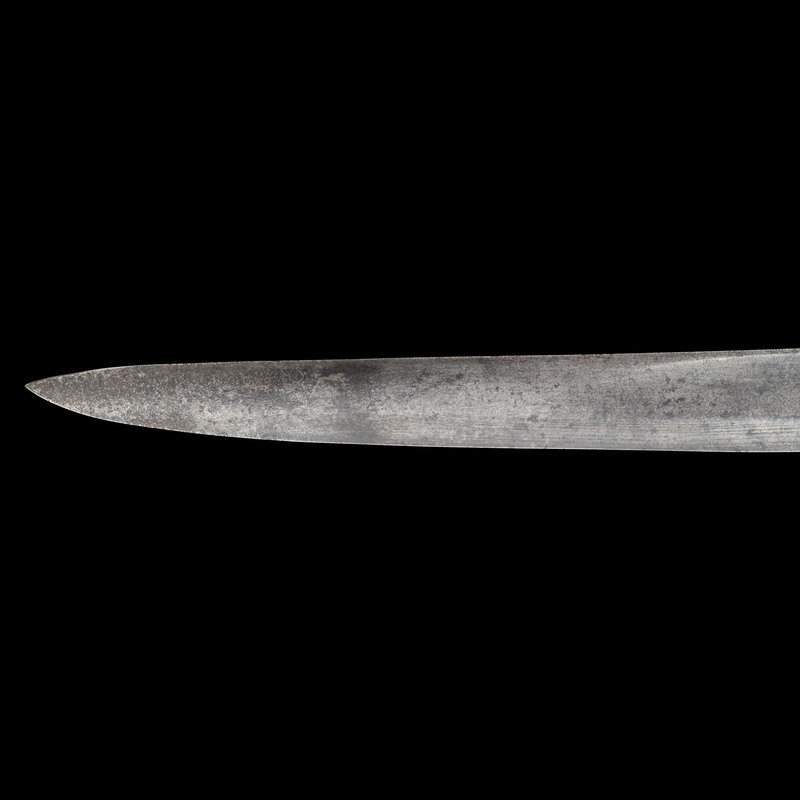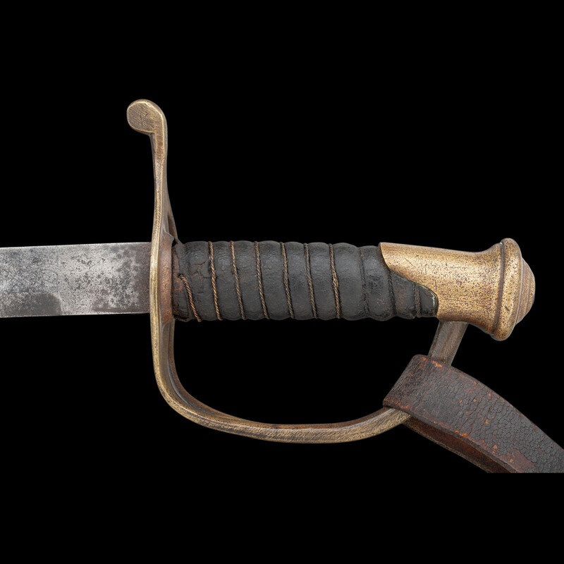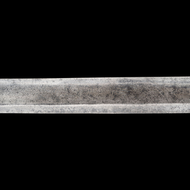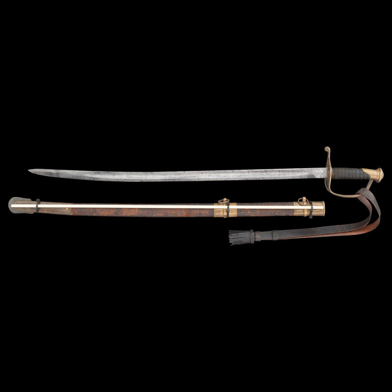 31.375" single edged spear point blade with a 23" unstopped median fuller. Blade 1.1" wide at ricasso. Overall length 37". 5.75" hilt with cast brass split branch guard with knuckle bow and Phrygian helmet pommel cap. Grooved wooden grip with leather covering and 10 wraps of twisted wire. Blade etched with a basket weave pattern as well as foliate and martial motifs. Etching is weak but visible. The sword is accompanied by a top seamed brass mounted leather scabbard.