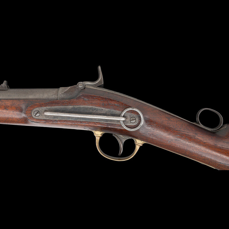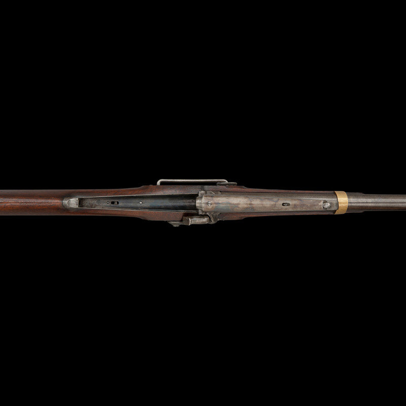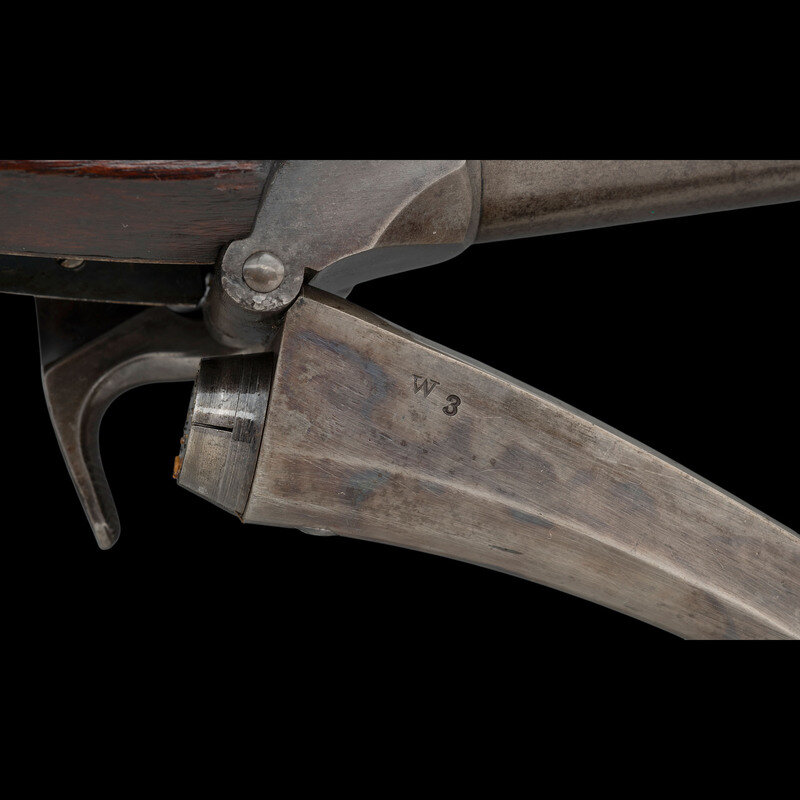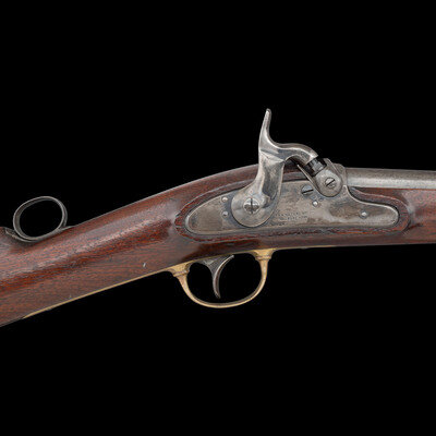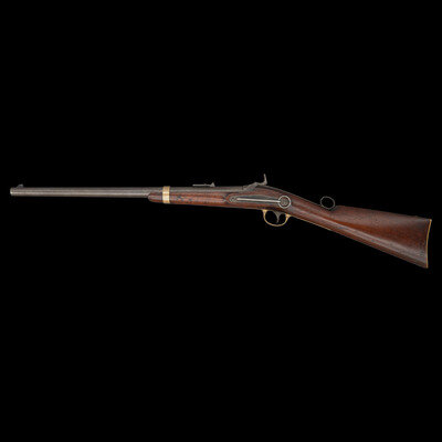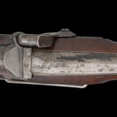 .54 caliber, 22.5" round barrel, NSN. Blued and color casehardened finish, brass triggerguard, buttplate and barrel band, walnut stock. Single shot breechloading percussion carbine, with folding ladder rear sight, dovetailed pinched sharks fin front sight and saddle bar and ring opposite lock. Top of breech lever marked in three lines PATD BY/B.F. JOSLYN/AUG. 23, 1855. Lock marked in two lines A.H. WATERS & CO/MILBURY MASS. Single brass barrel band marked T5, breech block marked with assembly mark W3 on the left side. Only 1,500 of these scarce and early production M1855 Joslyn breechloading percussion carbines were produced ca 1855-1856, with 1,200 going to the US government. A very scarce per-Civil War cavalry carbine. {ANTIQUE}