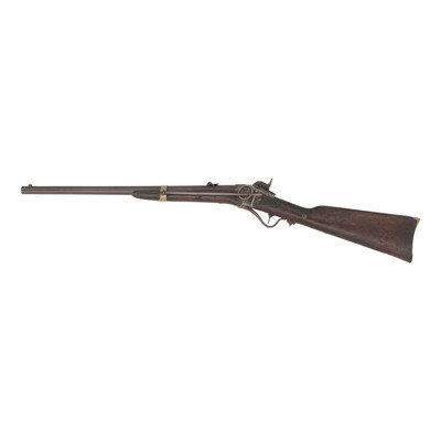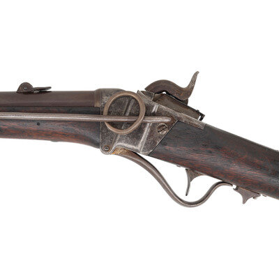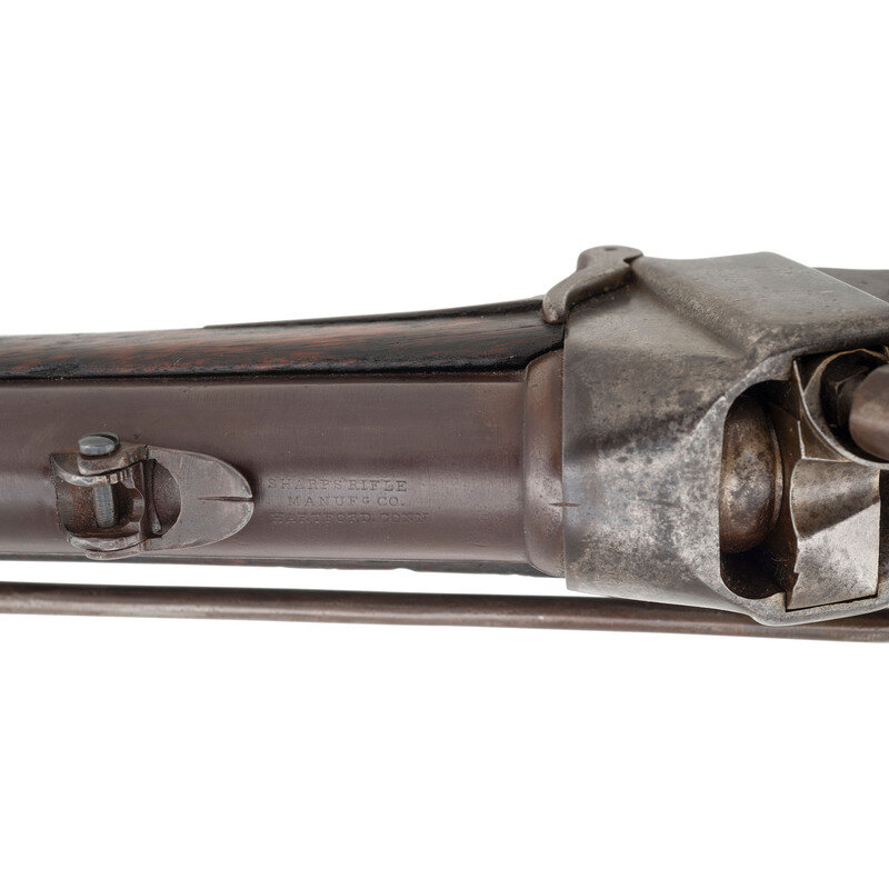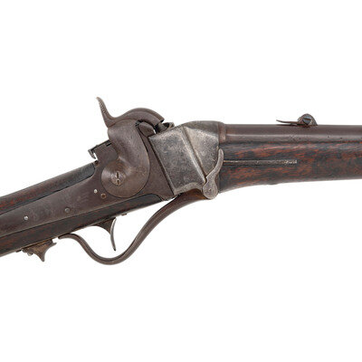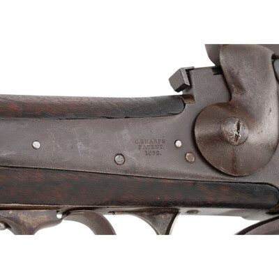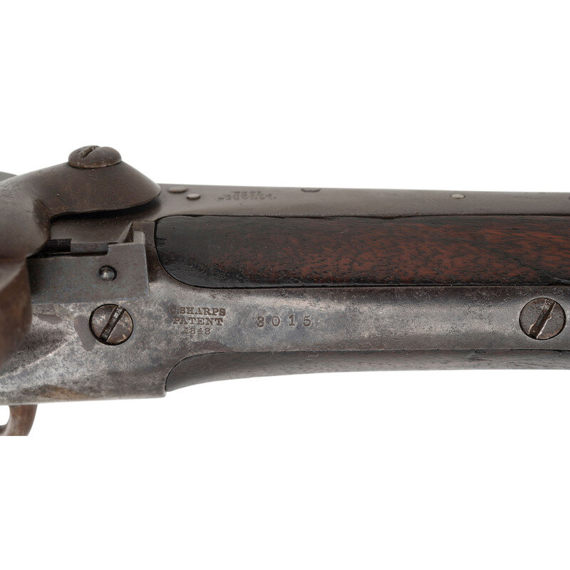 .52 caliber. 21.5" barrel. SN: 3015. Browned barrel, color casehardened receiver, brass furniture, walnut buttstock and forend. Single shot percussion breechloading slant breech carbine with Lawrence patent pellet priming system, M1852 folding notch "squirrel ear" rear sight, brass front sight blade and 9" long saddle bar with ring opposite lock. Matching serial numbers on receiver tang and under barrel, forend number weak but appears to match. Standard Sharps lock marking in three-lines C. SHARPS'/PATENT./1852., tang marked SHARPS/PATENT/1848 and with serial number, barrel marked SHARPS RIFLE/MANUFG CO/HARTFORD, CONN. This pattern of carbine was sold to the US military in some quantities. A search of the Springfield Research Service serial number books did not find this gun, but M1852 carbines #3010, only 5 numbers away, and #3029 which is 14 numbers away, were both issued to the 3rd New Hampshire Volunteer Cavalry. {ANTIQUE}
