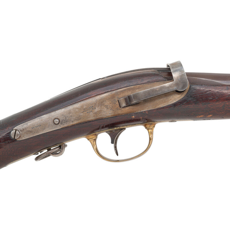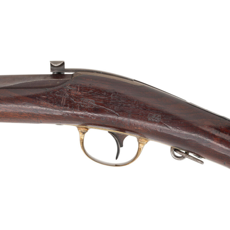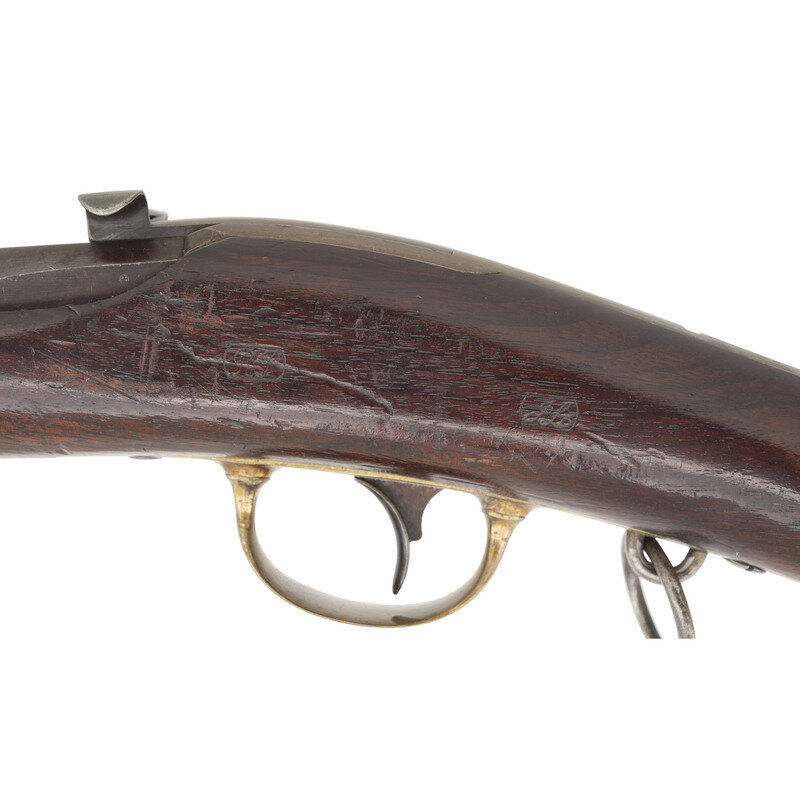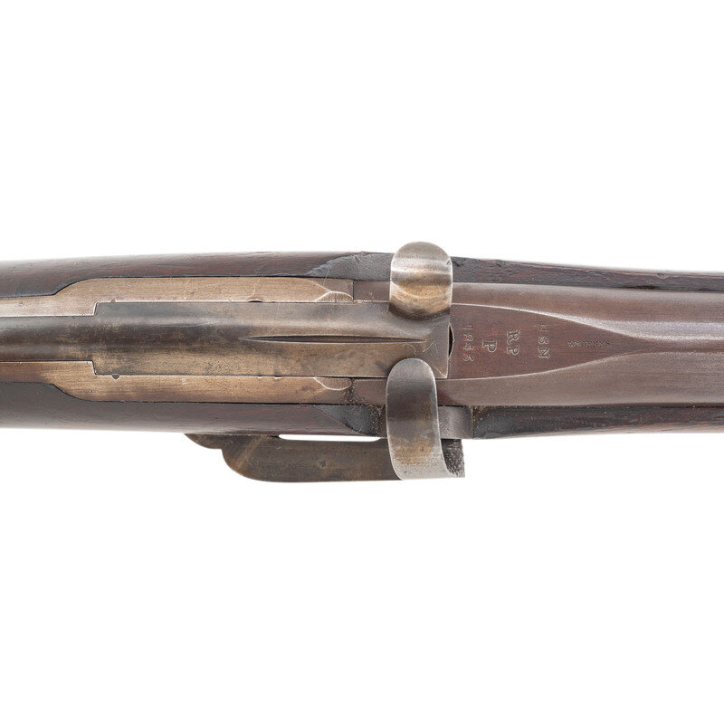 .54 caliber. 24.25" round barrel secured by a two flat brass screw-retained barrel bands. SN: 17/38. Browned and color casehardened finish, brass furniture, walnut stock. Single shot percussion breechloading rifled carbine with mule ear lock, brass blade front sight integral with the upper barrel band and sling ring in triggerguard plate. Breech marked: Wm Jenks and in four lines: USN/RP/P/1845. Mule-ear lock marked Wm Jenks at the tail and in three lines: NP AMES/ SPRINGFIELD/MASS. Interior of breech lever marked 17/38 in two lines. Two fine, crisp script cartouches are located on the counterpane, the RP of Richard Paine and the JL of Joseph Lanman. The carbine is in the typically encountered "modified" configuration with the oval rather than round loading aperture and a rifled bore. 4,250 of these distinctive "mule ear" lock percussion carbines were produced by the NP Ames company for the US Navy from 1843-1846. Originally they had round loading apertures and smooth bores. The large majority were subsequently altered to oval loading apertures and rifled bores like this gun. This is a very nice condition example of a scarce US Navy Carbine from the Mexican War period. {ANTIQUE}