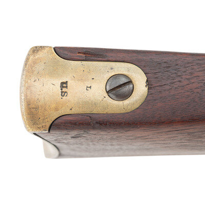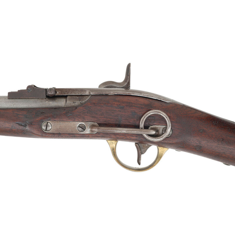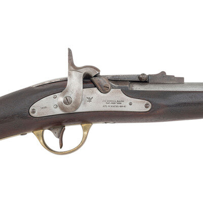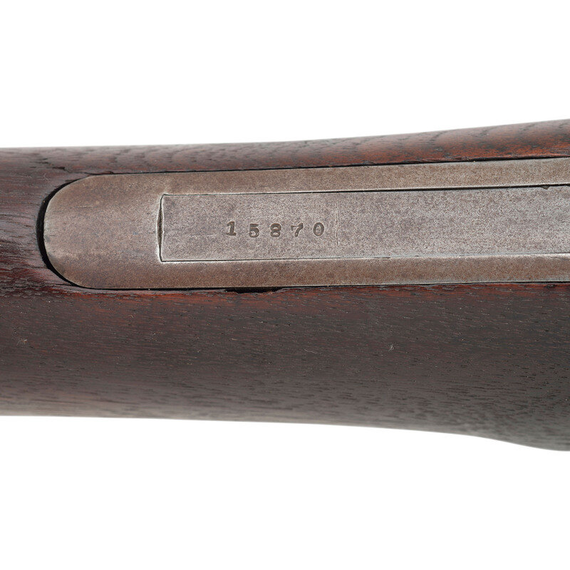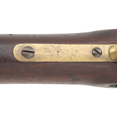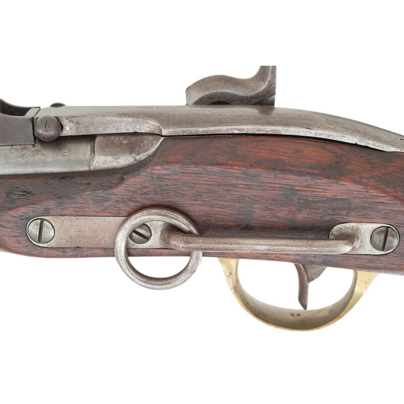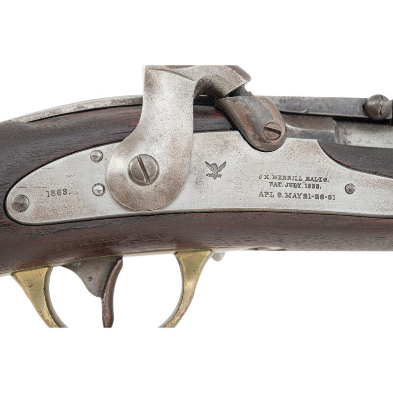 .54 caliber. 22" round barrel with single barrel band. SN: 15870. Bright finish, color casehardened lock and hammer, brass furniture, walnut stock. Single shot breechloading percussion carbine with Merrill's patent action. Lock marked in three horizontal lines J.H. MERRILL BALTO/PAT. JULY 1858/APL. 9 MAY 21-28-61 forward of the hammer and vertically in a single line at the tail with the date 1863. Breech lever marked J.H. MERRILL BALTO/PAT. JULY 1858 in two lines on the top along with the serial number 15870. A weak script RKW cartouche is visible on the counterpane above the sling bar, the mark of arsenal sub-inspector Robert K. Whitely. Numerous variations of Merrill carbine front and rear sights have been noted by students of the arms, as well as variations in patchboxes and other small parts. Carbine retains the original multi-leaf rear sight whose base doubles as the catch for the breech lever and retains the original rounded iron blade front sight. 2nd Model carbines were produced without patchboxes. A total of 14,495 Merrill carbines of both variants were produced with nearly all being purchased by the US Government for Civil War service. Many saw use with the 1st & 2nd Kentucky (US), 6th & 7th Indiana as well as the 14th Kansas Cavalry regiments. A search of the Springfield Research Service serial number books did not find this gun's serial number. {ANTIQUE}