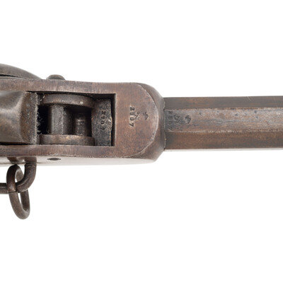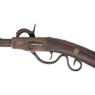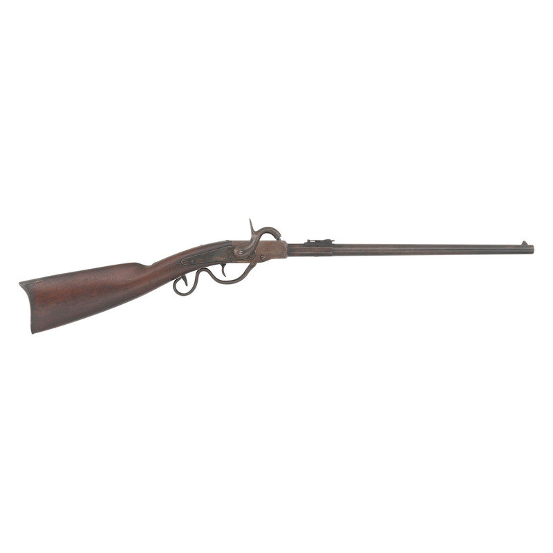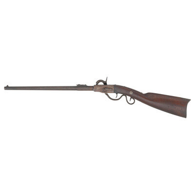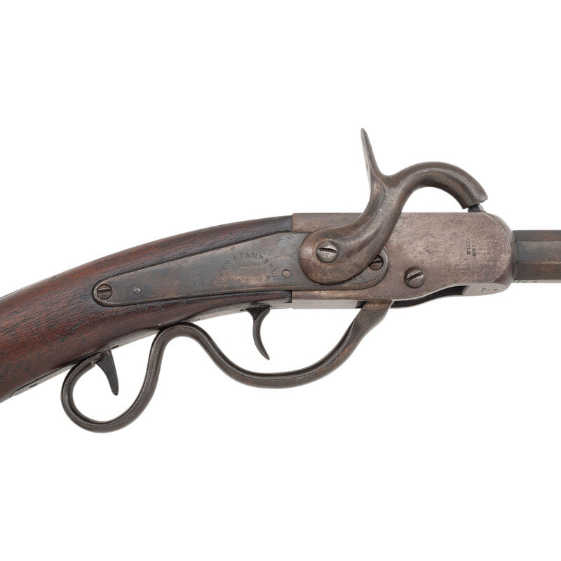 .52 caliber. 20" octagon to round barrel. SN: 2907. Blued and color casehardened finish, iron furniture, smooth walnut buttstock. Single shot percussion tilting breech percussion carbine with long base ladder rear sight graduated to 900 yards, iron blade front sight on large triangular base and sling bare and ring on reverse of frame. Lock marked GWYN & CAMPBELL in an arc over PATENT over 1862 over HAMILTON, O, with some of the markings quite weak. Obverse receiver marked UNION/RIFLE in two vertical line near the barrel. Matching serial numbers on bottom of barrel, bottom of receiver and lever. Matching mating mark 43 on bottom of barrel and receiver. No cartouches are present. Early production rounded serpentine hammer, early large loop triggerguard with rear trigger breech release. A total of 8,202 Gwyn & Campbell carbines were acquired on contract by the US Ordnance Department circa 1863-1864. Of those roughly 4,200 were of the "Type I" configuration, although some minor changes were made during the production of the guns, like the adoption of a shorter base ladder rear sight that would become standard on the Type II carbines. A search of the Springfield Research Serial Number books did not find this gun but the closest recorded gun to it is #2900 which was in the possession of Company B of the 14th Kansas Cavalry on July 30 of 1864. {ANTIQUE}