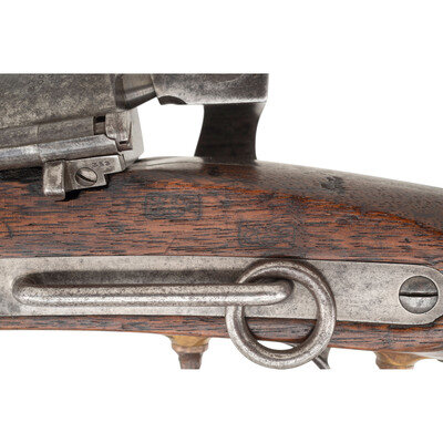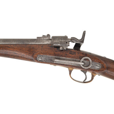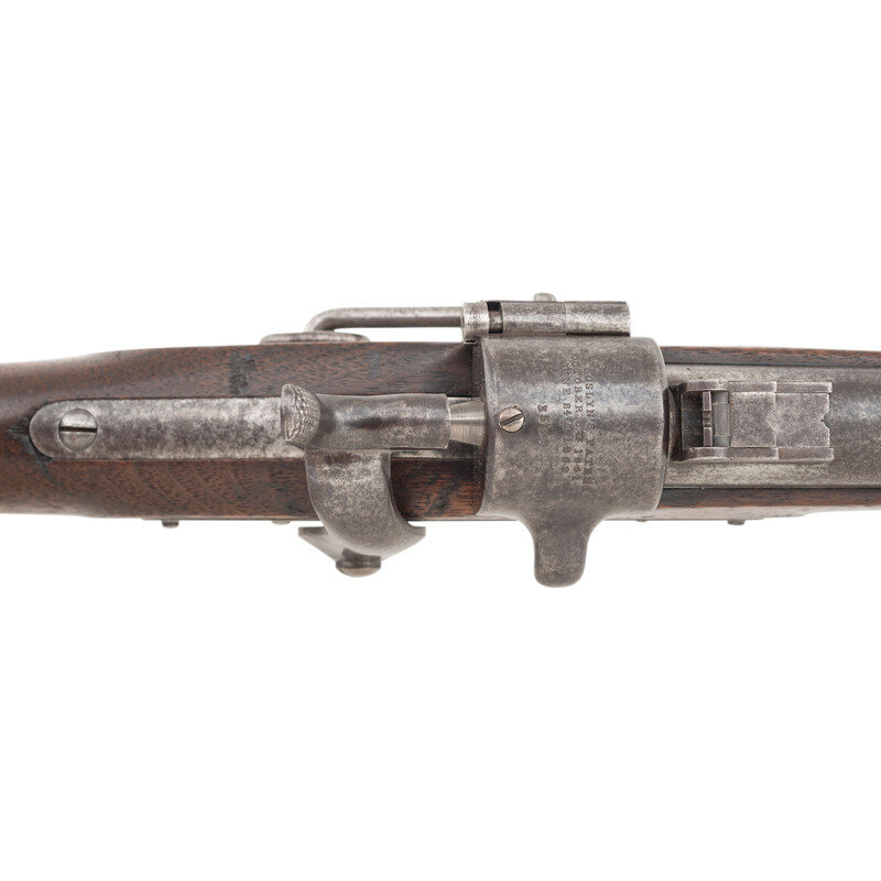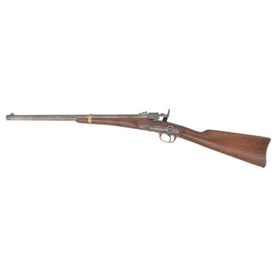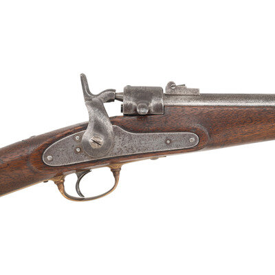 .52RF. 22" barrel. SN: 353. Blued barrel, color casehardened receiver and lock, brass furniture, walnut stock. Single shot breechloading military carbine with 1st pattern, friction latch breech block, M1861 3-leaf rear sight, pinched shark fin front sight and saddle bar and ring opposite lock. Lock marked in three lines, JOSLYN FIRE ARMS CO./STONINGTON/CONN. Top of breech marked in three lines: JOSLYN'S PATENT/OCTOBER 8TH, 1861/JUNE 24TH, 1862 and with the serial number. Matching serial number on hinge, no other numbers noted. Counterpane with a pair of mostly legible script EF cartouches, the mark of arsenal sub-inspector Edward Flather who inspected the earliest production Joslyn carbines, which were delivered in August of 1863. 2,200 1st Model Joslyns were acquired by the Ordnance Department followed by an additional 8,000 2nd Model carbines. The Joslyns saw use with a number of US volunteer cavalry regiments including the 4th & 8th Indiana, 19th New York 13th Tennessee (US), 9th Pennsylvania and 2nd Wisconsin, among others. A check of the Springfield Research Service serial number books did not find this specific gun, but #352, only 1 number away, was issued to Company F of the 19th New York Cavalry, as was #348. A number of the guns in the 3XX serial number range were issued to either F or H company of that regiment. Other records are fragmentary at best, so it is likely this gun was issued to another company of the 19th New York Volunteer Cavalry. A relatively scarce Civil War carbine, acquired in fairly small numbers when compared to carbines like the Smith, Burnside and Maynard. {ANTIQUE}