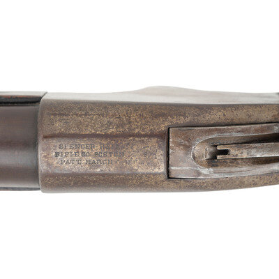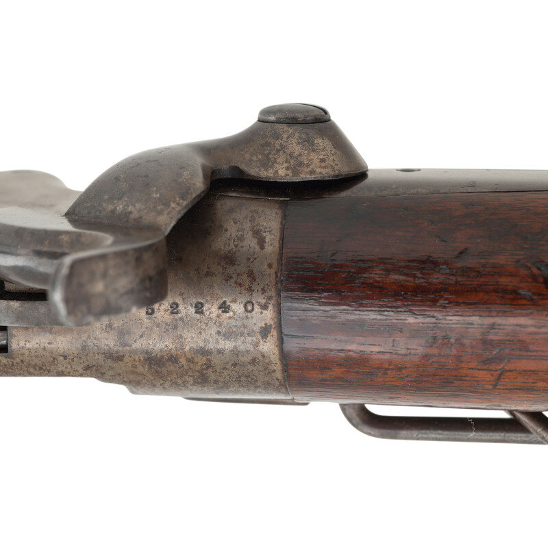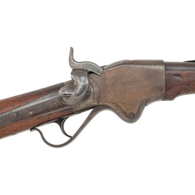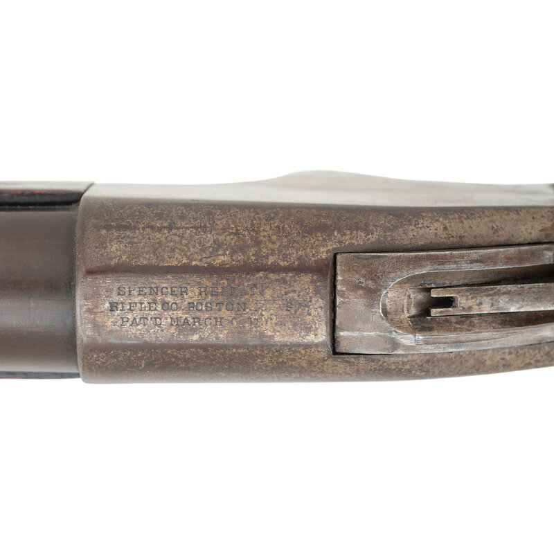 .56-56 Spencer. 22" round barrel secured by a single spring-retained barrel band. SN: 52240. Blued and color casehardened finish, walnut butt and forend. Seven-shot repeating lever action cartridge carbine with manually cocked hammer and tubular magazine in butt. Top of receiver marked in three lines: SPENCER REPEATING/RIFLE CO BOSTON MASS/PAT'D MARCH 6, 1860 with portions of the marking weak. Serial number on receiver tang. Two weak but mostly visible script cartouches are present on the reverse wrist with the MMJ of Martin McNary Johnson stamped vertically behind the sling bar and the very weak DAP of Dwight A Perkins stamped horizontally to the rear of the first cartouche. The name G.C. LAWS over Co. C. is neatly carved on the obverse stock. Carbine retains the original military folding ladder long range rear sight, pinned German silver front sight blade in iron base, the sling bar and ring and the sling swivel in the toe of the stock. The original and correct pattern magazine follower tube is in place in the butt. A search of the Springfield Research Service database did not find this carbine, however Spencer carbine #52238, only two numbers from this one, was issued to Company G of the 14th Kansas Volunteer Cavalry and #52252, only twelve numbers away was issued to Company B of the 7th Indiana Volunteer Cavalry. A search of the Civil War Data database found that George Clenden Laws (1845-1913) served in Company C of the 15th Pennsylvania Cavalry during the Civil War. Laws initially served in Company D of the Pennsylvania National Guard Infantry for a few days in September of 1862, before enlisting in Company H of the 15th PA Cavalry on October 10, 1862. During his service he transferred from Company H to Company C, as noted in the carving on the butt of the carbine. A portion of the regiment that was formed before Laws joined fought at Antietam, but afterwards the regiment spent the war in the Western Theater doing much of its service with the Army of the Cumberland. The regiment fought during the Stones River Campaign in Middle Tennessee in the winter of 1862-1863 and in 1863 fought in the Tullahoma Campaign and the Chickamauga Campaign, followed by the Chattanooga Campaign and Knoxville Campaign. In 1864 the regiment was temporarily dismounted to provide horses to those units that were participating in Sherman's Atlanta Campaign and subsequent March to the Sea. The regiment fought during the Nashville Campaign in late 1864 and then pursued Hood's retreating army into Alabama. In the spring of 1865 the regiment split up with some men helping to harass Lee's retreating army in Virginia, particularly around Lynchburg and the balance participating in the final North Carolina Campaign against Joe Johnston. After the war Laws worked as a physician and died in 1913. This is a solid example of a Civil War Spencer carbine which has not undergone post-war modifications for Indian War service and with a very plausible carved ID that was likely purchased by Laws when he mustered out of the unit in Nashville on June 21, 1865 and went home with him. {ANTIQUE}