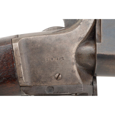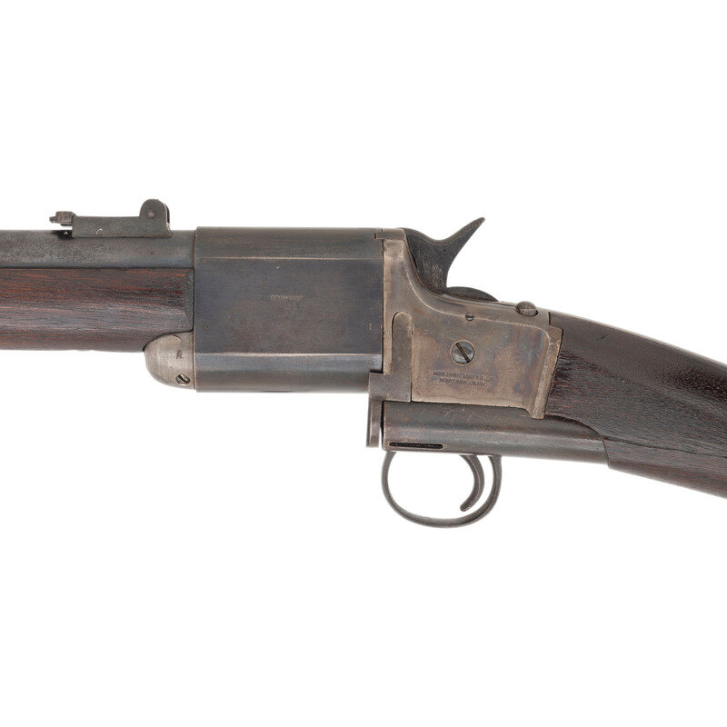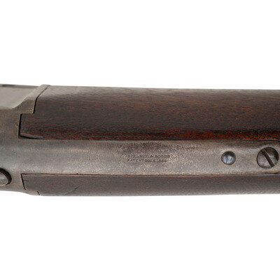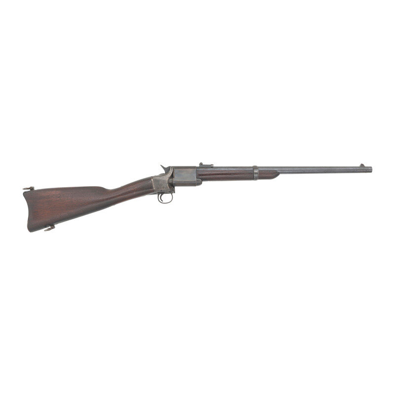 .50 rimfire. 22" barrel secured by a single solid, spring retained barrel band. SN: 1811. Blued and color case hardened finish, iron furniture, smooth walnut stock and forend. Twist action breechloading carbine with a 7-shot magazine in butt of stock with folding leaf adjustable ladder rear sight, dovetailed blade front sight and sling swivels on the barrel band and in stock toe and comb. Markings include Triplett & Scott patent marks on upper tang, Meriden Manufacturing Co. address marks on left of frame, and "KENTUCKY" on left of breech block. Tiny block letter "Y/W.B." mark stamped in reverse butt near buttplate. These carbines were manufactured from 1864-1865 and feature an unusual twist action that rotates the breech more than 180-degrees clockwise to come in line with magazine protruding from buttstock. 5,000 of these carbines were contracted for use by the Kentucky militia troops during the Civil War. Needs some mechanical attention. {ANTIQUE}