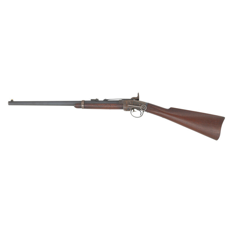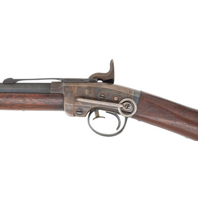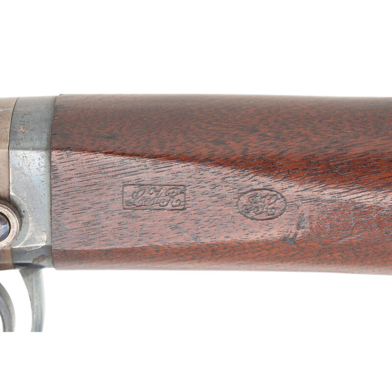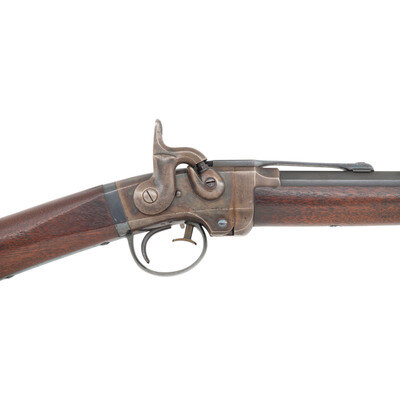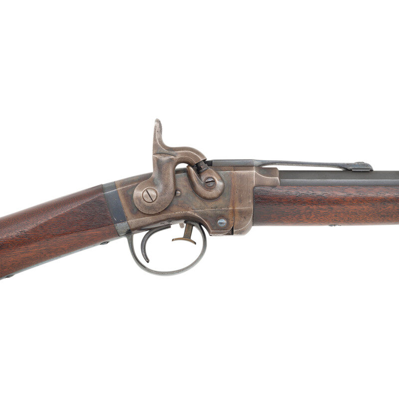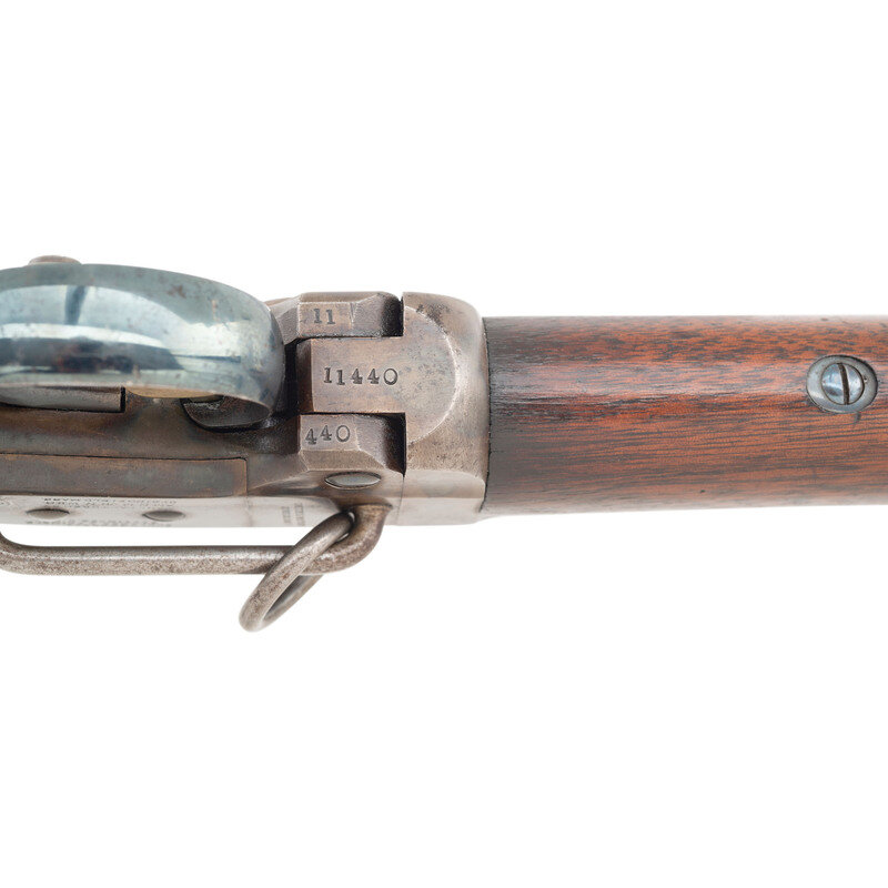 .50 caliber. 21.5" barrel. SN: 11440. Blued barrel, color casehardened frame, steel furniture, smooth walnut stock and forend. Single shot percussion break open breechloading carbine with ladder rear sight, German silver blade front sight and sling bar and ring opposite the lock. Standard American Machine Works, Poultney & Trimble and Smith patent markings on receiver. Matching serial numbers on receiver and barrel. Two clear script cartouches are present on the reverse wrist, an LFR and a JH. One of the most successful of the American Civil War breechloading carbines, some 30,000 Smith Carbines were produced during the war with the guns seeing service with numerous US volunteer cavalry regiments, including the 7th & 11th Illinois, 17th Pennsylvania and 6th & 9th Ohio. A search of the Springfield Research Service serial number books did not find this serial number, but the two closest guns, #11337 and #11475 were both issued to Company L of the 1st Alabama Volunteer Cavalry (US). {ANTIQUE}
