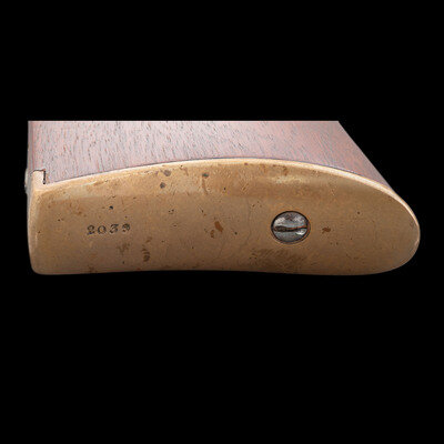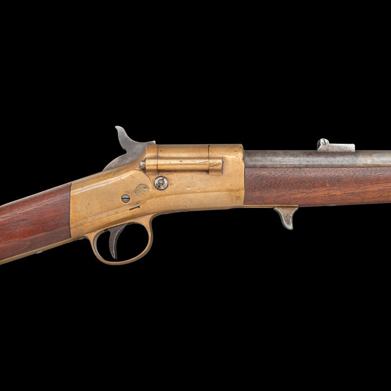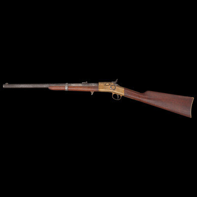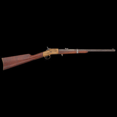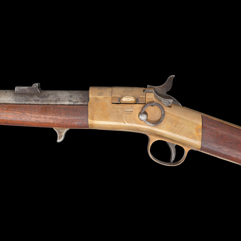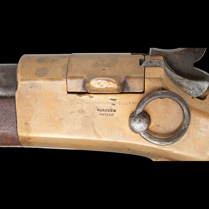 .50RF. 20" barrel. SN: 2039. Blued finish, brass receiver, triggerguard and buttplate, walnut stock and forend secured to the barrel by a single spring retained solid barrel band and a screw. Single shot breechloading rimfire carbine with hinged breechblock, correct pattern L-shaped leaf rear sight with two apertures in the long leaf, original front sight, saddle ring on left of frame. Left side of receiver marked in three-lines: JAMES WARNER SPRINGFIELD, MASS./WARNER'S/PATENT, with the upper line very weak and difficult to read. Serial number on buttplate and under barrel. Martially sub-inspected throughout with a capital "L," on buttplate tang, bottom of receiver and barrel. Left of barrel also stamped with a C.S.L. inspection. Matching assembly number 22 inside breech and breech block. Only 1,501 were produced circa 1864. This is a very scarce secondary US martial carbine from the Civil War period in lovely and untouched condition. {ANTIQUE}