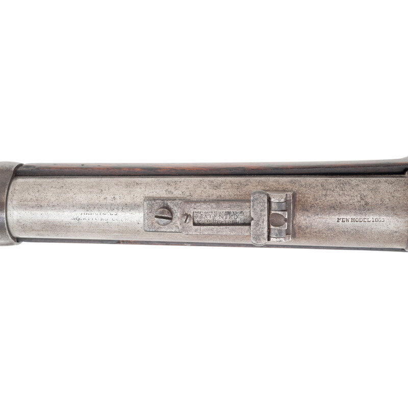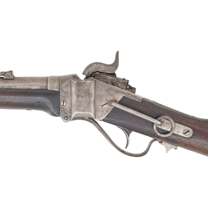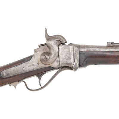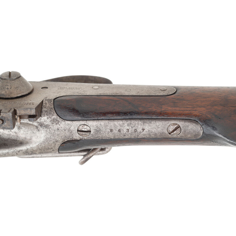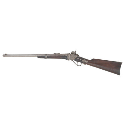 .52 caliber. 22" barrel secured by a single spring-retained barrel band. SN: 84307. Blued and color casehardened finish, walnut buttstock with iron patchbox and smooth forend with single barrel band. Single shot percussion ignition breechloading carbine with Lawrence's patent pellet priming system, Lawrence patent M1859 folding ladder military rear sight, German silver front sight blade on base, and saddle bar and ring on the reverse of the frame. Lock with usual Sharps and Lawrence patent information, reverse frame with 1848 Sharps patent marking. Barrel marked NEW MODEL 1863 forward of receiver and with three line Sharps address forward of rear sight. No cartouches are present in the wood. The matching serial number 84307 is present on the barrel, under the forend. While this gun did not appear in the Springfield Research Service 4 volume set of serial numbers several close numbers were noted, including #84312, #84320 & #84333, all issued to Company K of the 19th Pennsylvania Volunteer Cavalry and #84296 issued to Company M of the 9th Illinois Volunteer Cavalry. A scarce "transition" carbine, in the range of the change over in configuration and markings from the New Model 1859 to the New Model 1863. This gun bears the NM1863 markings but retains the NM1859 patchbox. {ANTIQUE}