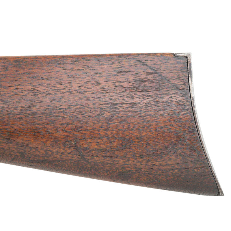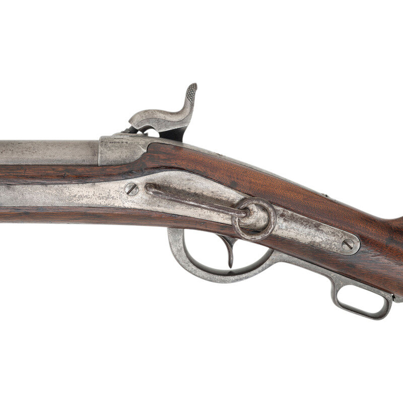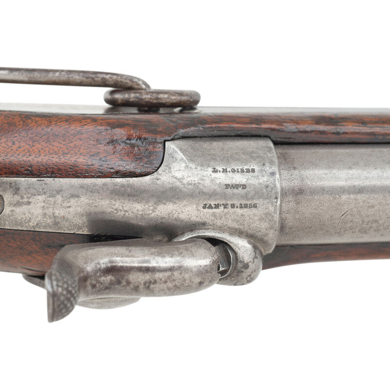 .52 caliber. 22" barrel secured by a single barrel band. NSN. Blued and color casehardened finish, smooth walnut stock and forend. Single shot percussion breechloading carbine with lever actuated tilting barrel action, M1861 pattern multi-leaf rear sight, dovetailed pinched front sight, and sling bar with ring. Lock marked in two lines, WM F BROOKS/MANF'S NEW YORK with the breech marked in three lines, L.H. GIBBS/PATND/JANY 8, 1856. U.S. marked buttplate tang, sub-inspection stamp B on left of breech. No visible cartouches. The Gibbs carbine story is a long and interesting one. The design was appealing enough to the US Ordnance Department that 10,000 of the carbines were ordered, however only 1,052 were deliver. This is because the factory was destroyed by fire during the July 1863 Draft Riots in New York. The earliest production examples have locks marked as this one is, with later production guns have an American Eagle on the lock along wth the date 1863. The majority of the Gibbs carbines delivered were issued to the 10th Missouri Cavalry (about 500) with many of the remaining guns going to the 13th & 16th New York Cavalry. A very rare secondary US Civil War carbine that is not often seen for sale {ANTIQUE}