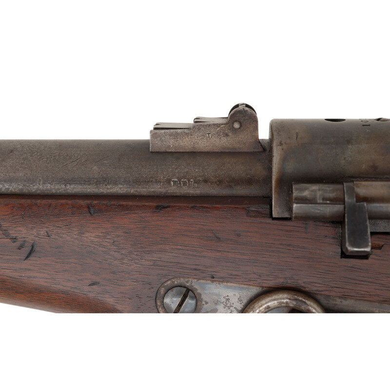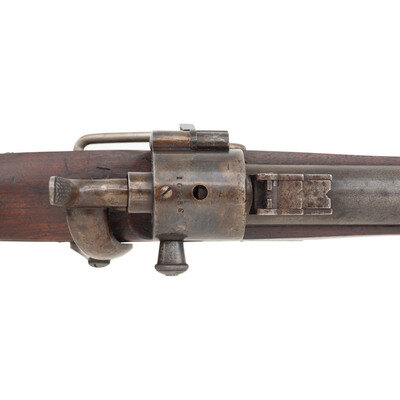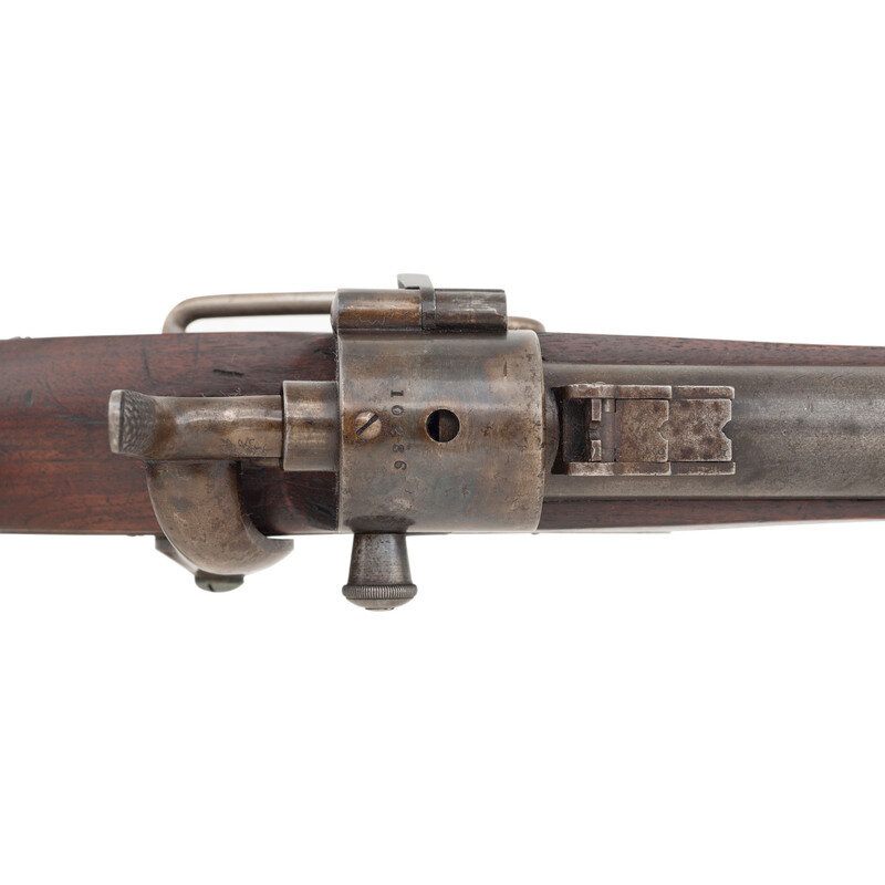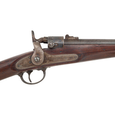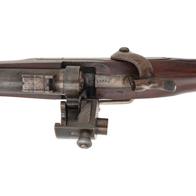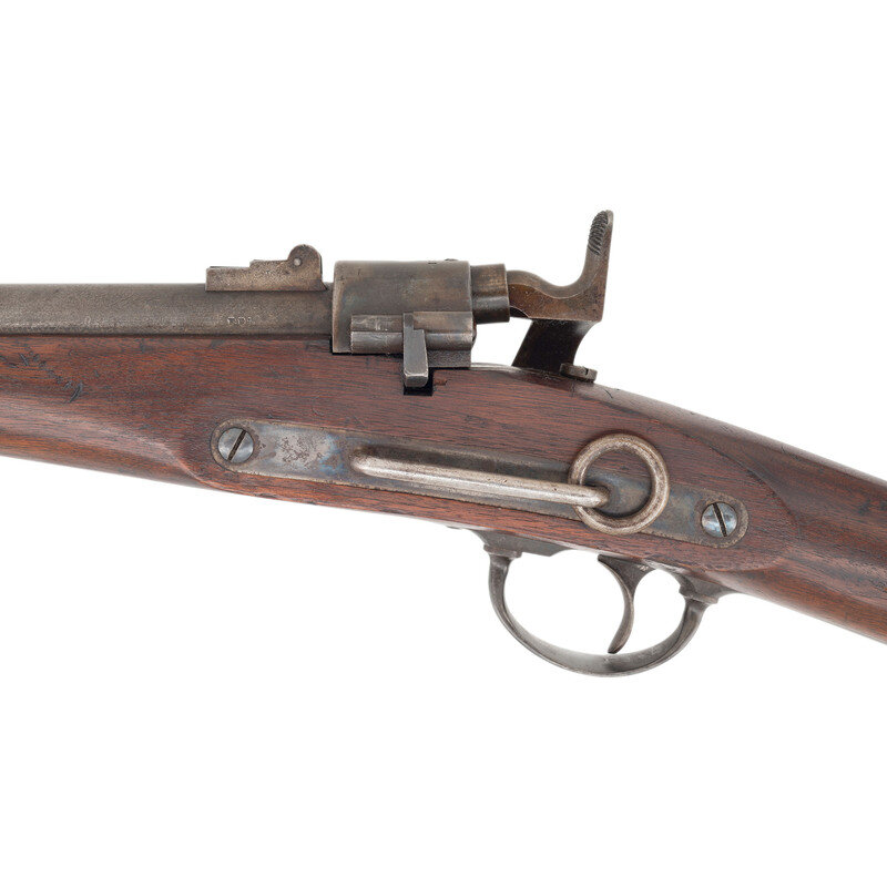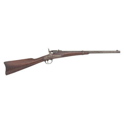 .52 RF. 22" barrel. SN: 10286. Blued barrel, color casehardened lock and hammer, blued iron furniture, walnut stock. Single shot, breechloading cartridge carbine with 1861 pattern 3-leaf rear sight, iron blade front sight and saddle bar with ring. Lock marked in three horizontal lines JOSLYN FIREARMS Co/STONINGTON, CONN /1864. Breechblock and breech tang both numbered 10286. Left of barrel breech with a F.D.L. sub-inspection. No cartouches are present on the flat opposite the lock. 2nd Model pull release breech latch as is standard on these later production guns, along with iron furniture including a single barrel band secured by a spring. Roughly 12,500 of these 2nd Model (M1864) carbines were produced with 8,000 being acquired by the US Government, like this one, and the balance being sold commercially. A solid example of one of the interesting secondary carbines of the Civil War period. {ANTIQUE}