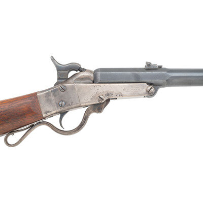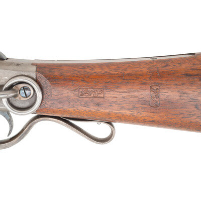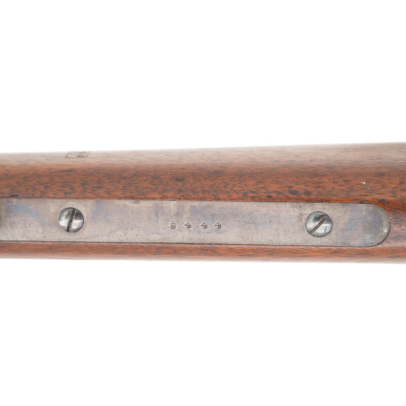 .50 caliber. 20" barrel. SN: 8444. Blued barrel, color casehardened frame, iron furniture, blued screws, smooth, straight gripped walnut stock. Single shot percussion tip down barrel breechloading carbine with three leaf rear sight, pinched blade front sight and saddle ring on the reverse of the receiver. Standard three-line Massachusetts Arms Company marking on lower right of receiver and standard patent markings on lower left. Serial number on lower tang. Two clear and correct script cartouches on reverse wrist, a GWS and a JM. The Maynard Carbine was one of the most successful breechloading percussion carbines of the American Civil War, due to its simple and robust design. Slightly more than 20,000 were delivered between 1863 and 1865 with many of the guns seeing use with Indiana Volunteer Cavalry Regiments, including the 6th, 9th & 11th. The Maynard was also issued to the 11th Tennessee Cavalry (US). A search of the Springfield Research Service serial number books did not find this carbine, but the closest one listed, #8556 was issued to Company L of the 6th Indiana Cavalry. {ANTIQUE}