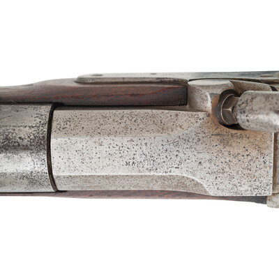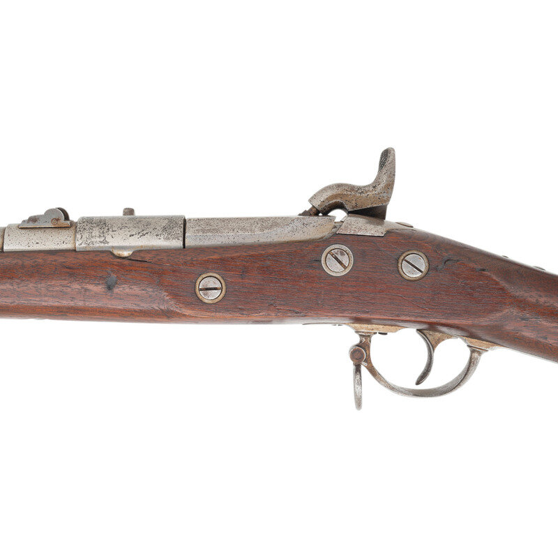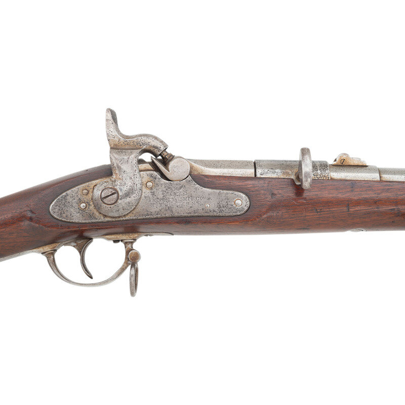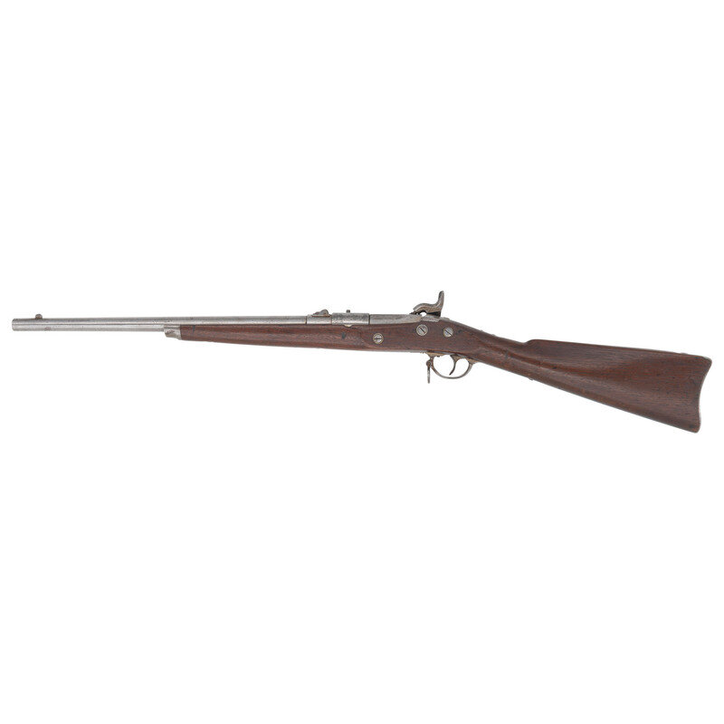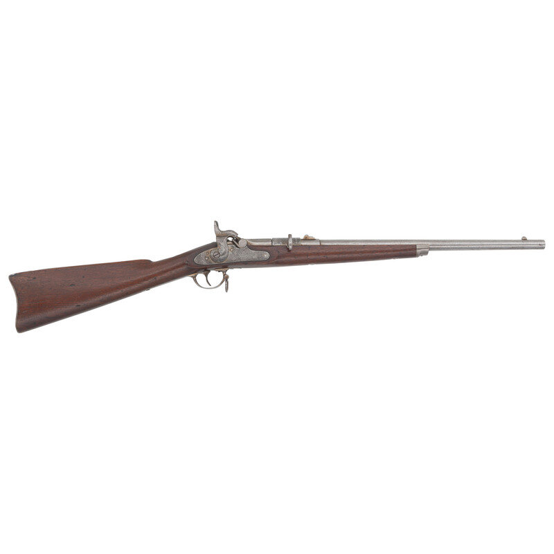 .58 caliber. 19.5" round barrel. SN: NSN. Bright finish, walnut stock. Rotating breech, percussion ignition, breech loading carbine based upon Edward Linder's patent. Lock marked U {Spread-Winged Eagle} S/AMOSKEAG MFG CO/MANCHESTER, NH. and dated 1864 at tail. Breech weakly marked EDWARD LINDNER'S/PATENT/MARCH 29, 1859 with only part of the last line legible. Retains correct pattern multi-leaf rear sight mounted forward of the breech rather than on the tang as on the earlier variant of this gun. Also retains correct musket-style front sight and sling ring on triggerguard bow which replaced the sling bar on the earlier Amoskeag made variants. The very first Lindner-type carbines produced were modifications of surplus Austrian rifles and were the actual first Lindner deliveries which should be referred to as "1st Model" guns, but are generally forgotten in firearms history. These 400 guns were specifically requisitioned for issue to the 1st Michigan Cavalry. Later production guns were produced by Amoskeag Manufacturing Co of Manchester, NH with the first type unmarked and with approximately 500 accepted for US military service, while the 2nd type with Amoskeag marked locks were never accepted and were finally sold off during the Franco-Prussian War circa 1870. These 6,000 marked Amoskeag 2nd Model Lindner Carbines utilized a large number of Special Model 1861 style rifle musket parts in their production to make them easier and cheaper to produce. Due to the Franco-Prussian War sales, these later Amoskeag production Lindner carbines are relatively rare in the United States are often in hard-used condition when found. This is a good example of a relatively scarce 2nd Model Amoskeag Linder carbine. {ANTIQUE}