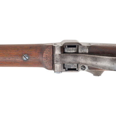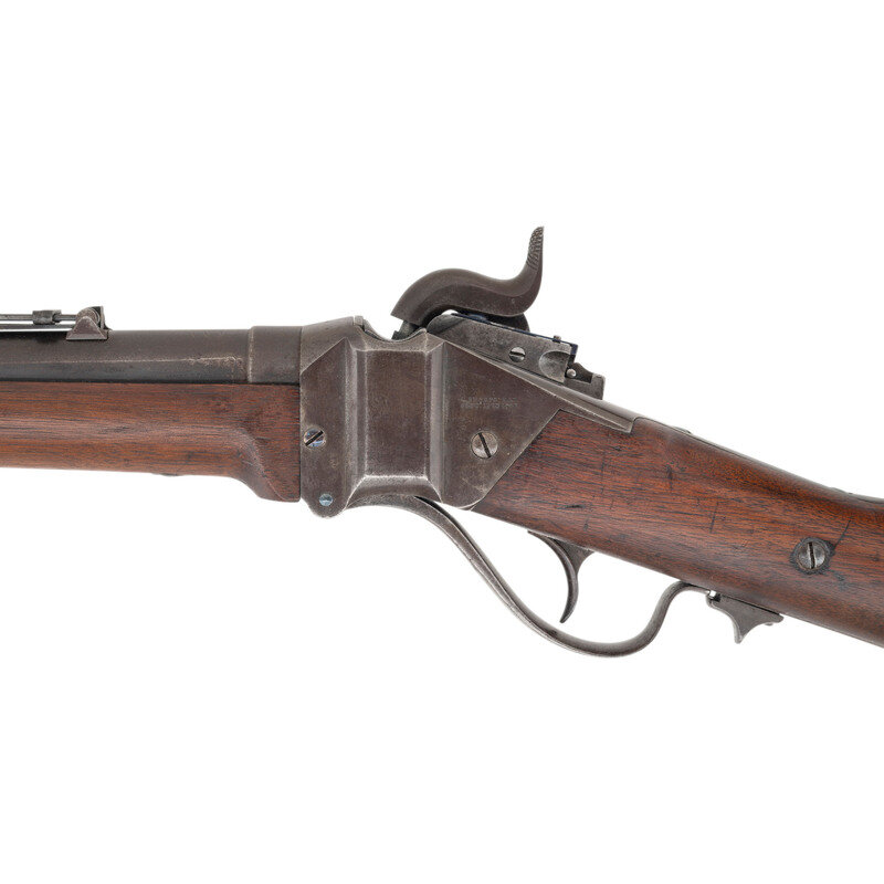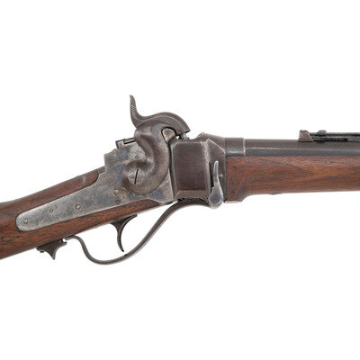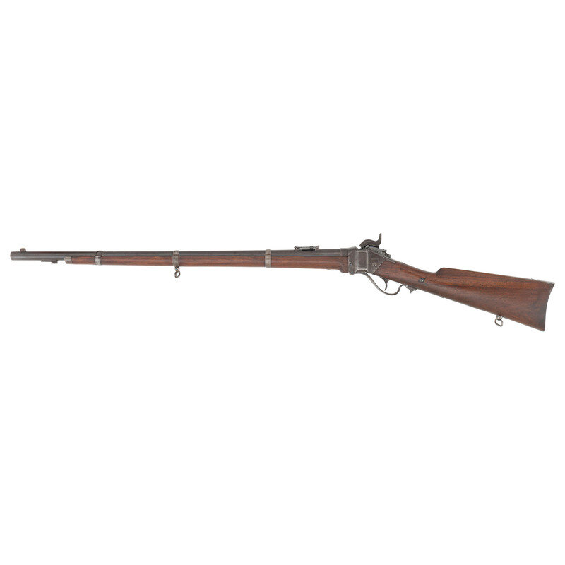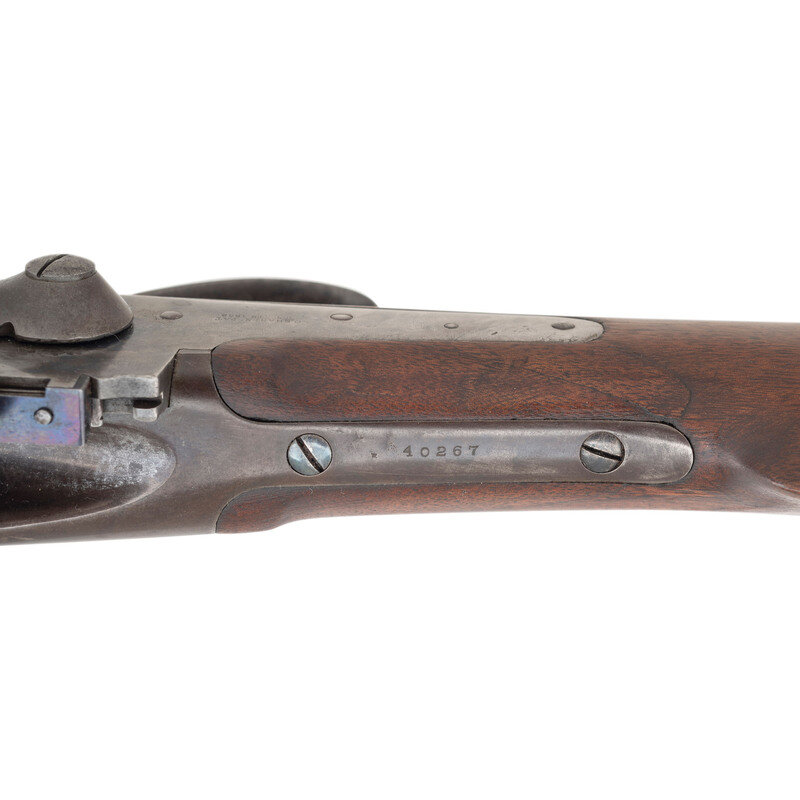 .52 Caliber. 30" round barrel secured by three rounded, solid, spring-retained bands. SN: 40267. Blued and color casehardened finish, iron furniture, walnut stock and forend. Single shot breechloading percussion rifle with Lawrence Patent pellet primer. Lock with standard Sharps' and Lawrence's patent markings, reverse breech block with Sharps' patent markings as well. Barrel marked NEW MODEL 1859 between breech and rear sight, with standard three-line address forward of the rear sight. Lawrence patent marked sight base with long ladder graduated to 800 yards, Barleycorn musket style front sight base with brass blade, saber bayonet lug under barrel with 1" guide key. No sub-inspector marks or cartouche present. Mounted with correct iron patchbox in obverse stock. Retains both sling swivels. This rifle falls in the serial number range of the "Mitchell Contract" New Model 1859 Rifles (nominally 39,XXX-4,1XXX) that were acquired for the US Navy during June-July of 1861. These Navy acquired rifles were not regularly marked with any inspection or ownership stamps. A very nice Civil War era Sharps New Model 1859 Rifle. {ANTIQUE}