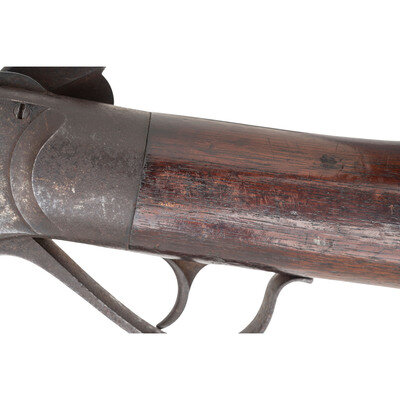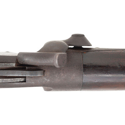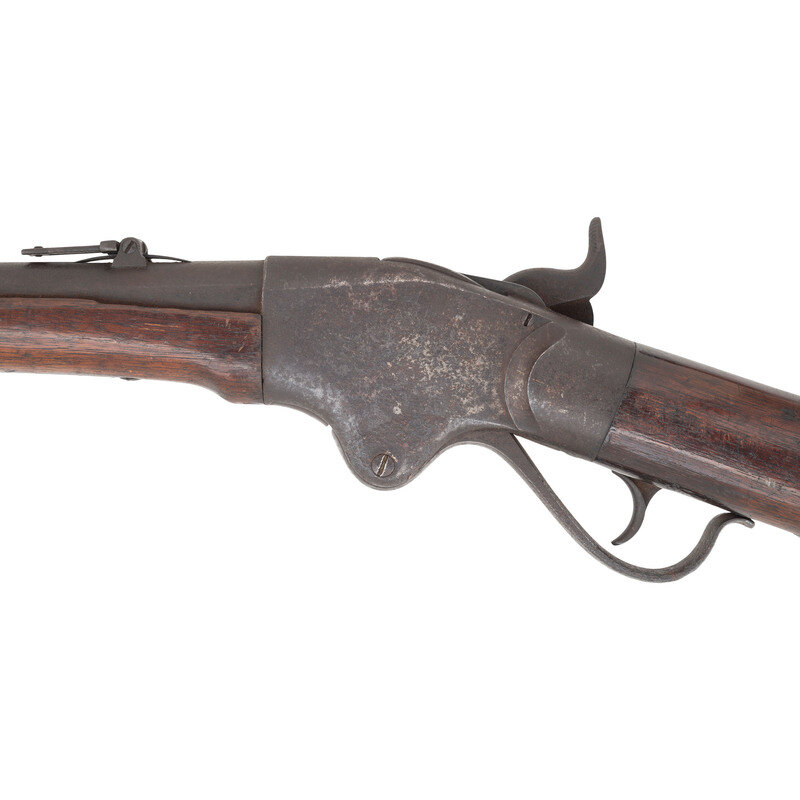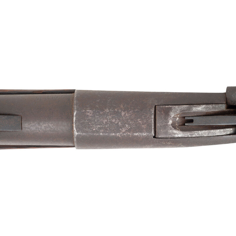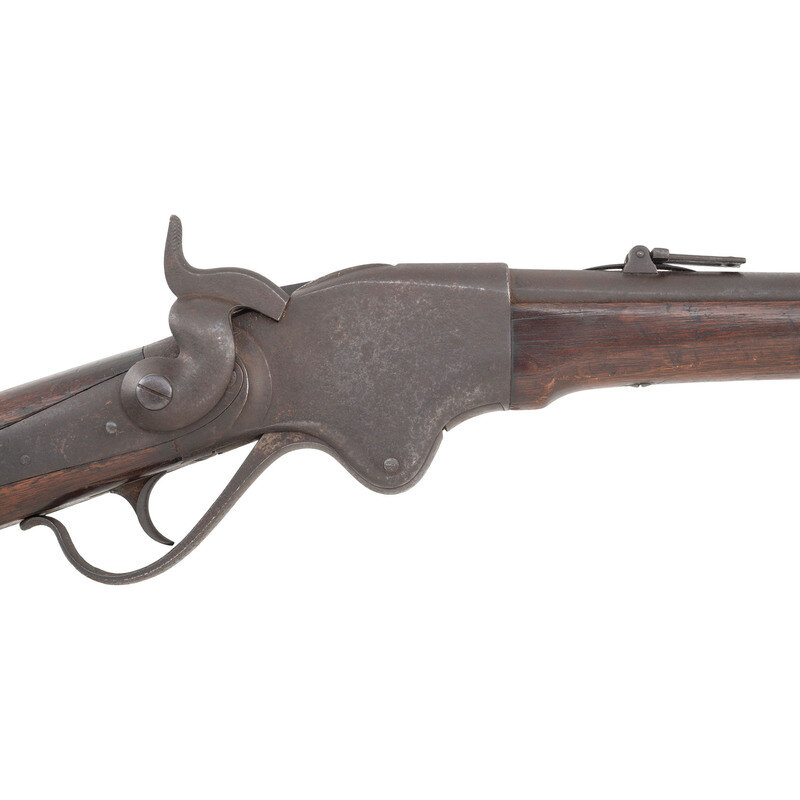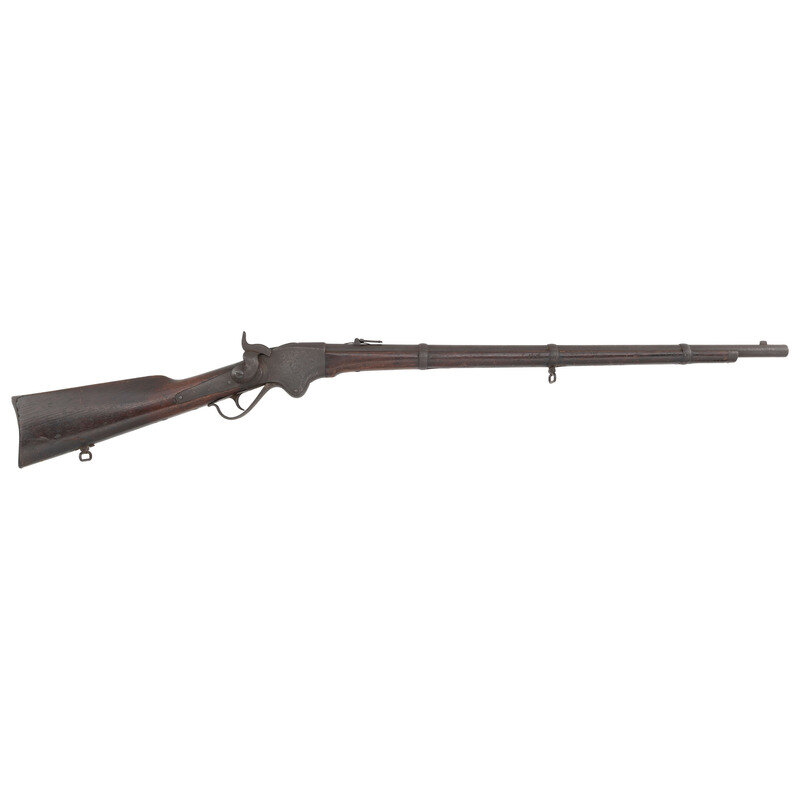 .56-52 (56-56) Spencer caliber. 30" barrel. SN: 2037. Blued and color casehardened finish, walnut stock and forend secured by three solid, spring-retained barrel bands. Lever action, manually cocked repeating rifle with seven round tubular magazine in butt, military folding ladder rear sight, Barleycorn combination front sight and socket bayonet lug and sling swivels on the middle band and in toe of stock. Top of receiver marked in three lines: SPENCER REPEATING / RIFLE CO BOSTON MASS / PAT'D MARCH 6 1860. Reverse wrist with traces of a a script cartouche. Retains the correct pattern magazine follower tube in the butt. The only Spencer firearms at Gettsyburg were the early deliveries of rifles to the state of Michigan for the 5th and eventually 6th Michigan Cavalry. A detailed analysis of surviving correspondence and records by noted author and researcher Wiley Sword, suggests that many of the Spencer Rifles in 1000-1550 serial number range and 1551 to 2050 range were delivered for use by the 5th Michigan Cavalry and those guns not needed by that regiment, which was initially some 1,200 strong but was down to about 900 men by the time of the rifles being issued, were passed on to the 6th Michigan Cavalry. A copy of Wiley Sword's detailed article accompanies the rifle. A search of the Springfield Research Service Serial Number books did not find this rifle, but did find several close to it. The closest guns were #2044 which was issued to the 6th Independent Company of Ohio Sharpshooters and #2049 which was issued to Company B of the 8th Independent Volunteer Cavalry. Other close guns were #1973 which went to Company E of the 148th Pennsylvania Volunteer Infantry, #1978 which was issued to Company H of the 11th Kentucky Volunteer Cavalry and #2058 which was issued to the 5th Independent Company of Ohio Sharpshooters. As such, it is difficult to know to what regiment this rifle may have been issued, but it is abundantly clear that it was in service with a US regiment by the summer of 1863 and likely saw hard service for the balance of the war. A solid, essentially untouched example of an early production Civil War Spencer Rifle that has survived without any of the post-war, Indian War era upgrades and modifications.